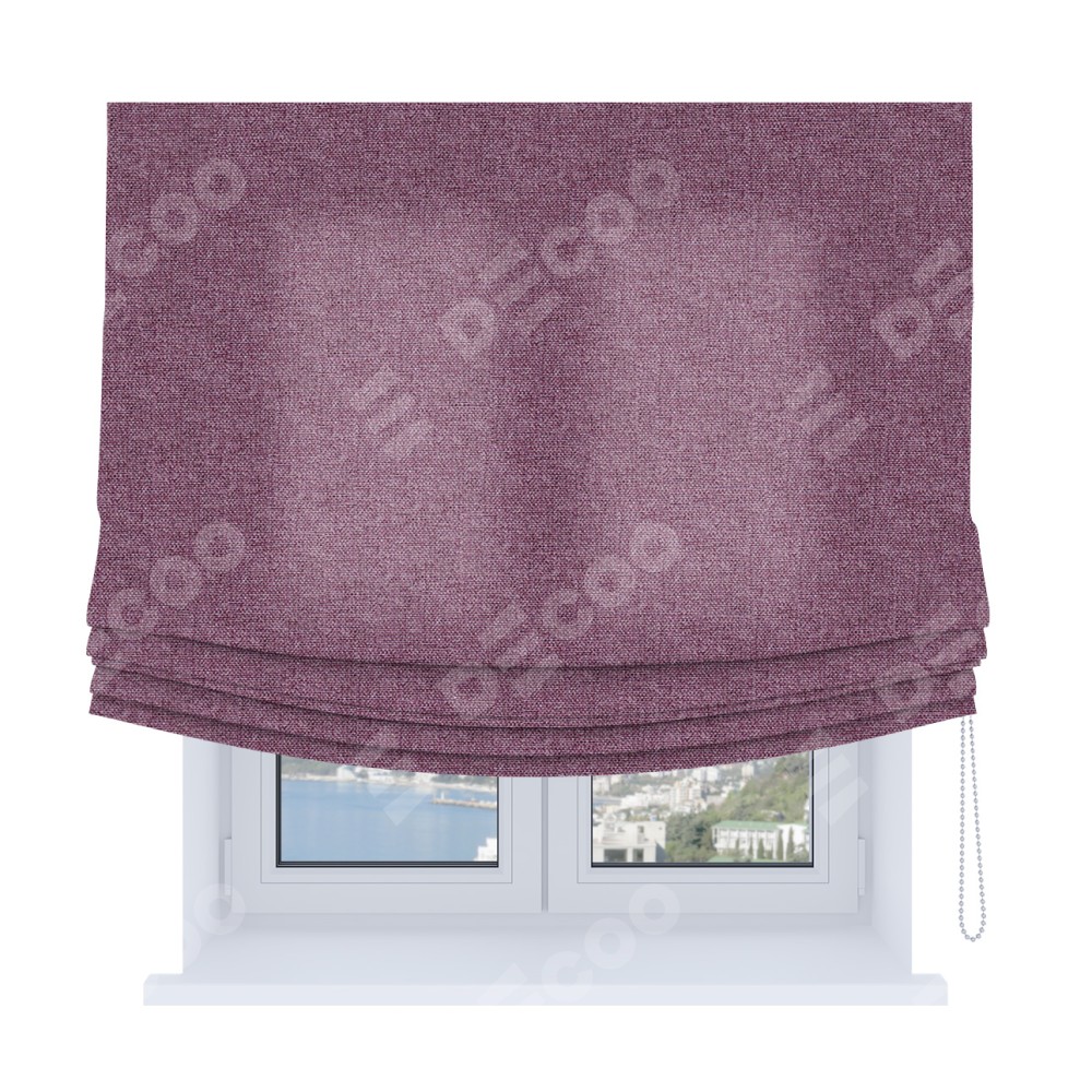 Римская штора Soft производителя «Cortin», используется для проёма, пошита из ткани лён кашемир сиреневый, артикул ткани 21620. Имеет универсальный механизм и подходит для монтажа: на потолок, на стену и в нишу. В отличие от стандартных римских штор, римская штора Soft не имеет горизонтальных вставок и нижнего отвеса. Это позволяет ткани произвольно драпироваться в свободные мягкие складки.