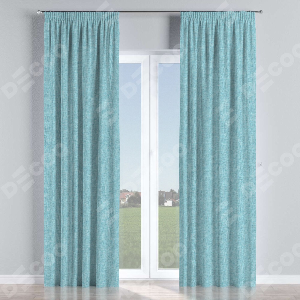 Комплект прямых штор, от производителя «Cortin», пошиты из ткани лён кашемир голубой, артикул ткани 21616. С изнаночной стороны в верхней части штор пристрачивается шторная лента с декоративными складками «Карандаш». Для создания элегантных складок прямые шторы шьются по стандарту с коэффициентом 1:2 (на 100 см. ширины проёма 200 см. ширины ткани).