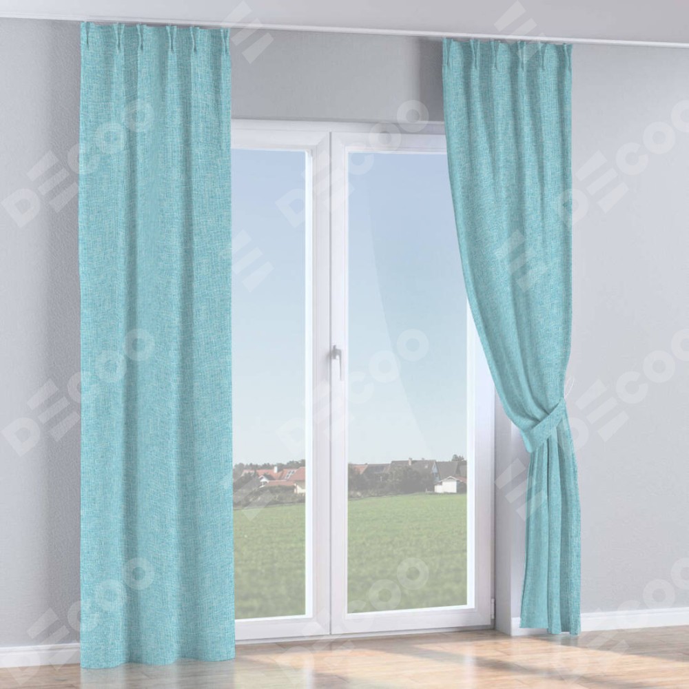 Комплект прямых штор, от производителя «Cortin», пошиты из ткани лён кашемир голубой, артикул ткани 21616. С изнаночной стороны в верхней части штор пристрачивается шторная лента с декоративными складками «Кустик». Для создания элегантных складок прямые шторы шьются по стандарту с коэффициентом 1:2 (на 100 см. ширины проёма 200 см. ширины ткани).