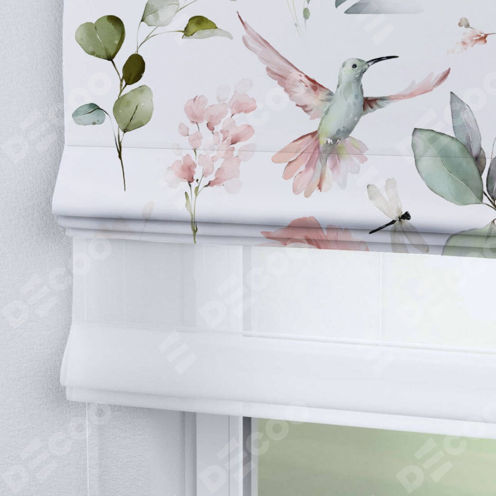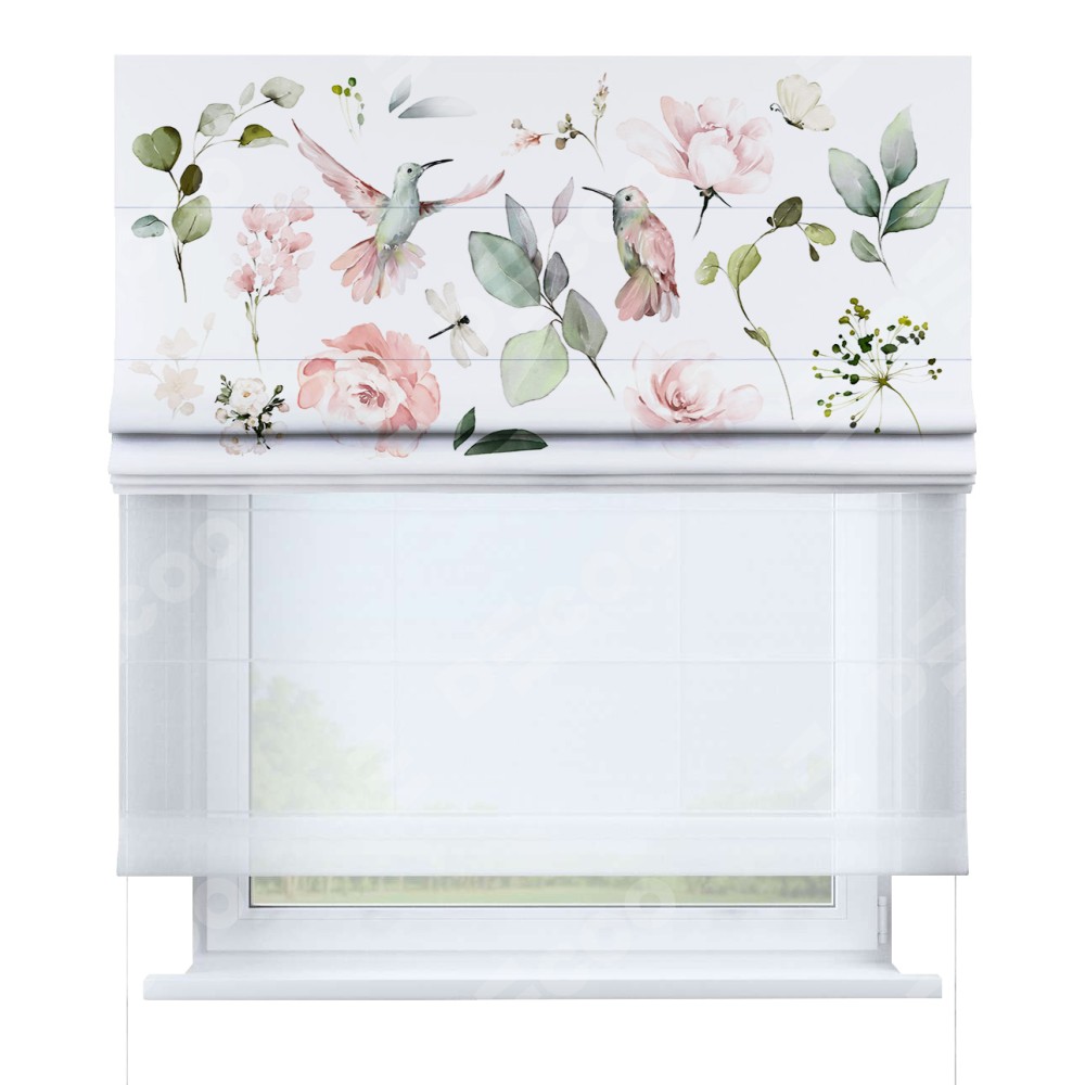 Римская штора день-ночь производителя «Cortin», используется для проёма, пошита из двух полотен, с лицевой блэкаут с нанесением сублимационной печати «Уютный сад», вторая ткань тюль (по стандарту комплектуется тюль белого цвета артикул V-01). Имеет универсальный механизм и подходит для монтажа: на потолок, на стену и в нишу.
