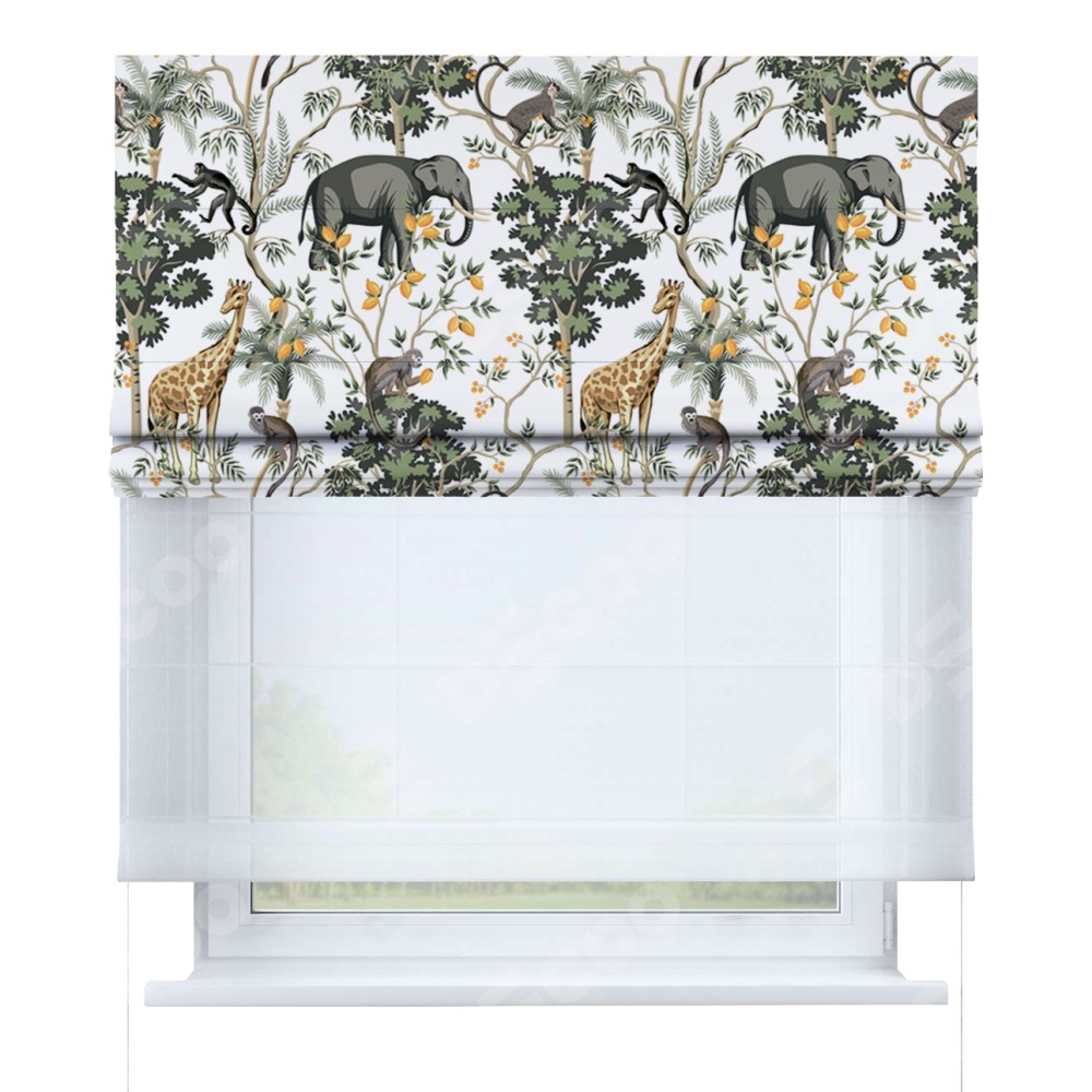 Римская штора день-ночь производителя «Cortin», используется для проёма, пошита из двух полотен, с лицевой блэкаут с нанесением сублимационной печати «Африканские равнины», вторая ткань тюль (по стандарту комплектуется тюль белого цвета артикул V-01). Имеет универсальный механизм и подходит для монтажа: на потолок, на стену и в нишу.