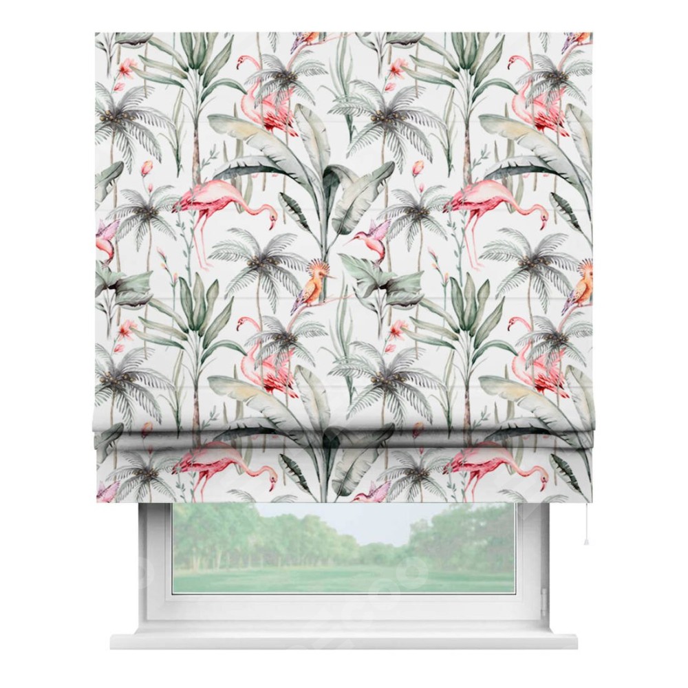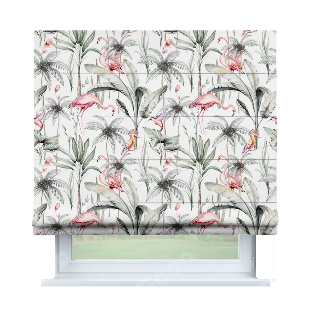 Римская штора производителя «Cortin», используется для проёма, пошита из ткани блэкаут с нанесением сублимационной печати «Изящные фламинго». Имеет универсальный механизм и подходит для монтажа: на потолок, на стену и в нишу.
