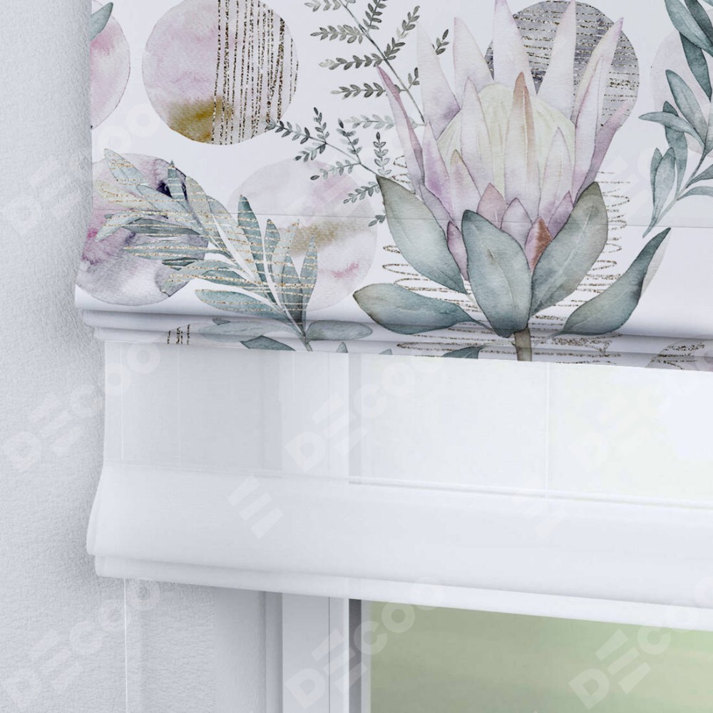 Римская штора день-ночь производителя «Cortin», используется для проёма, пошита из двух полотен, с лицевой блэкаут с нанесением сублимационной печати «Розовый лотос», вторая ткань тюль (по стандарту комплектуется тюль белого цвета артикул V-01). Имеет универсальный механизм и подходит для монтажа: на потолок, на стену и в нишу.