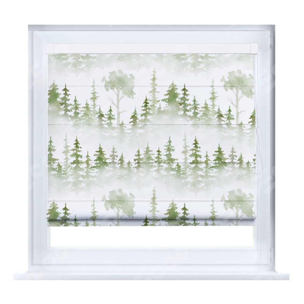 Римская штора «Кортин» на створку «Туманный лес» отлично подойдёт для интерьера: в спальню, на балкон и в кухню.