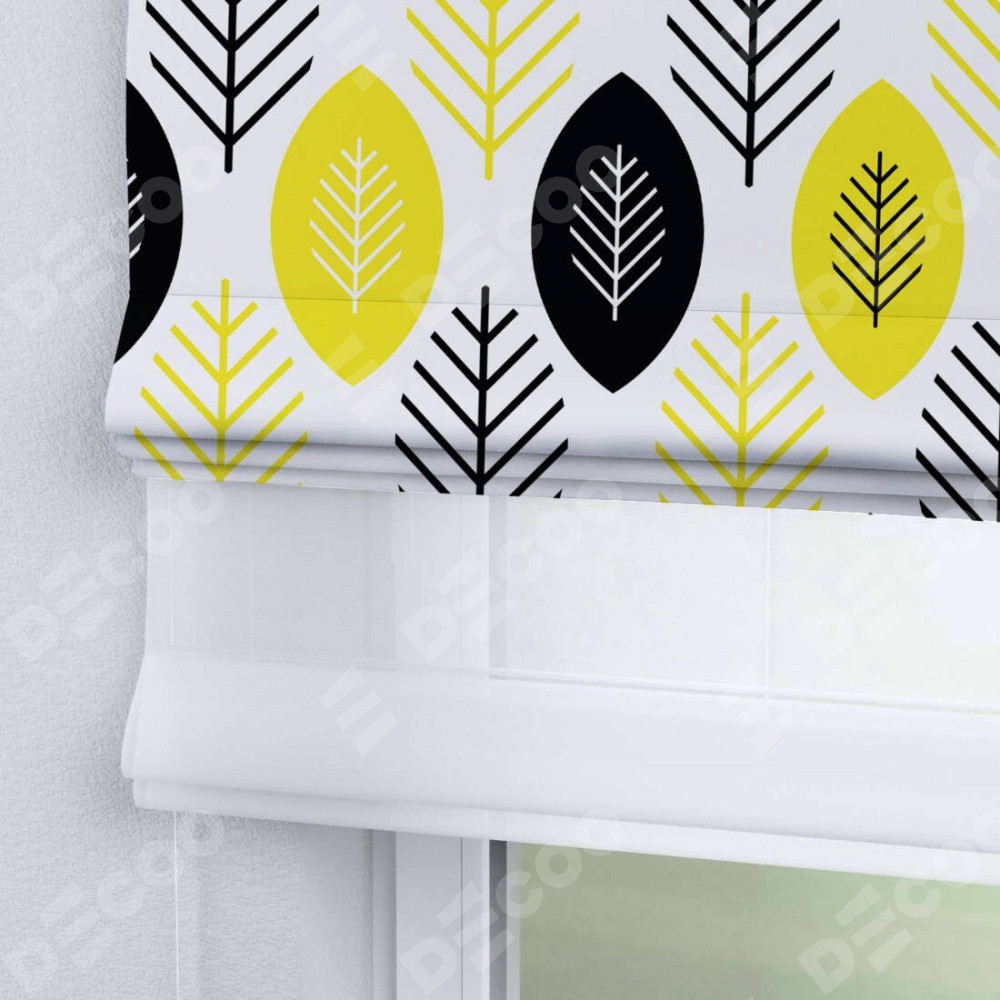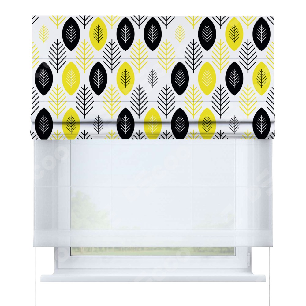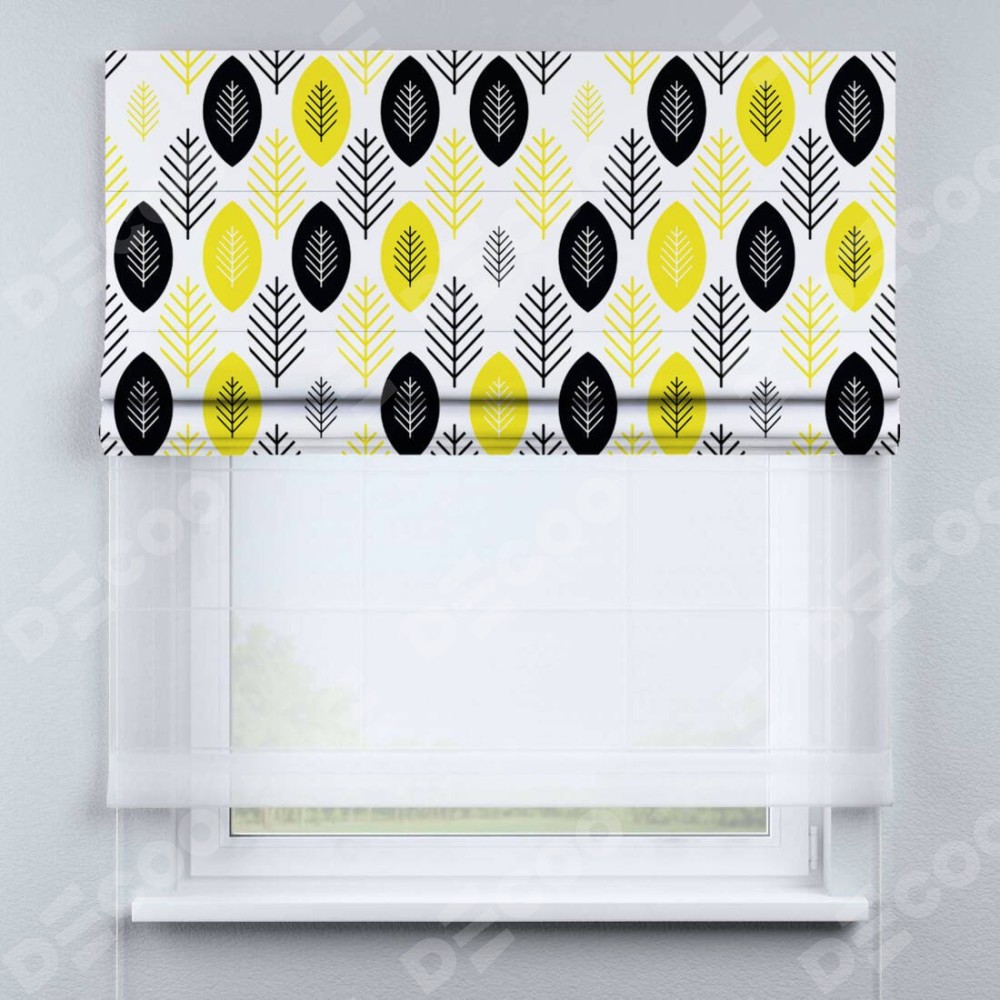 Римская штора день-ночь производителя «Cortin», используется для проёма, пошита из двух полотен, с лицевой блэкаут с нанесением сублимационной печати «Черно-желтый модерн», вторая ткань тюль (по стандарту комплектуется тюль белого цвета артикул V-01). Имеет универсальный механизм и подходит для монтажа: на потолок, на стену и в нишу.