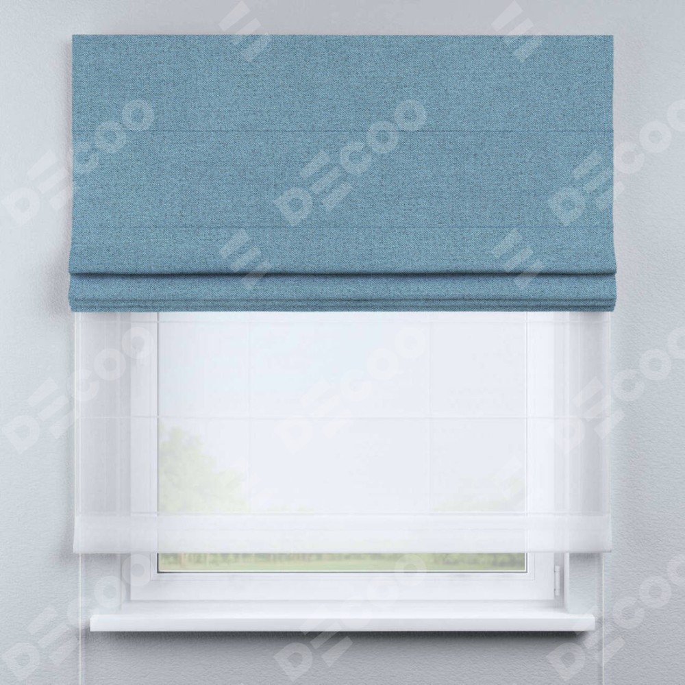 Римская штора день-ночь производителя «Cortin», используется для проёма, пошита из двух полотен, с лицевой стороны лён блэкаут голубой артикул 69574, вторая ткань тюль (по стандарту комплектуется тюль белого цвета артикул V-01). Имеет универсальный механизм и подходит для монтажа: на потолок, на стену и в нишу.