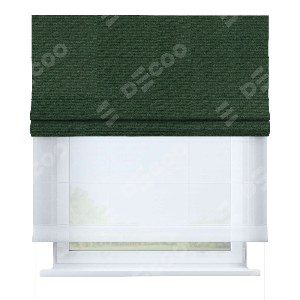 Римская штора день-ночь производителя «Cortin», используется для проёма, пошита из двух полотен, с лицевой стороны лён блэкаут зелёный артикул 69497, вторая ткань тюль (по стандарту комплектуется тюль белого цвета артикул V-01). Имеет универсальный механизм и подходит для монтажа: на потолок, на стену и в нишу.