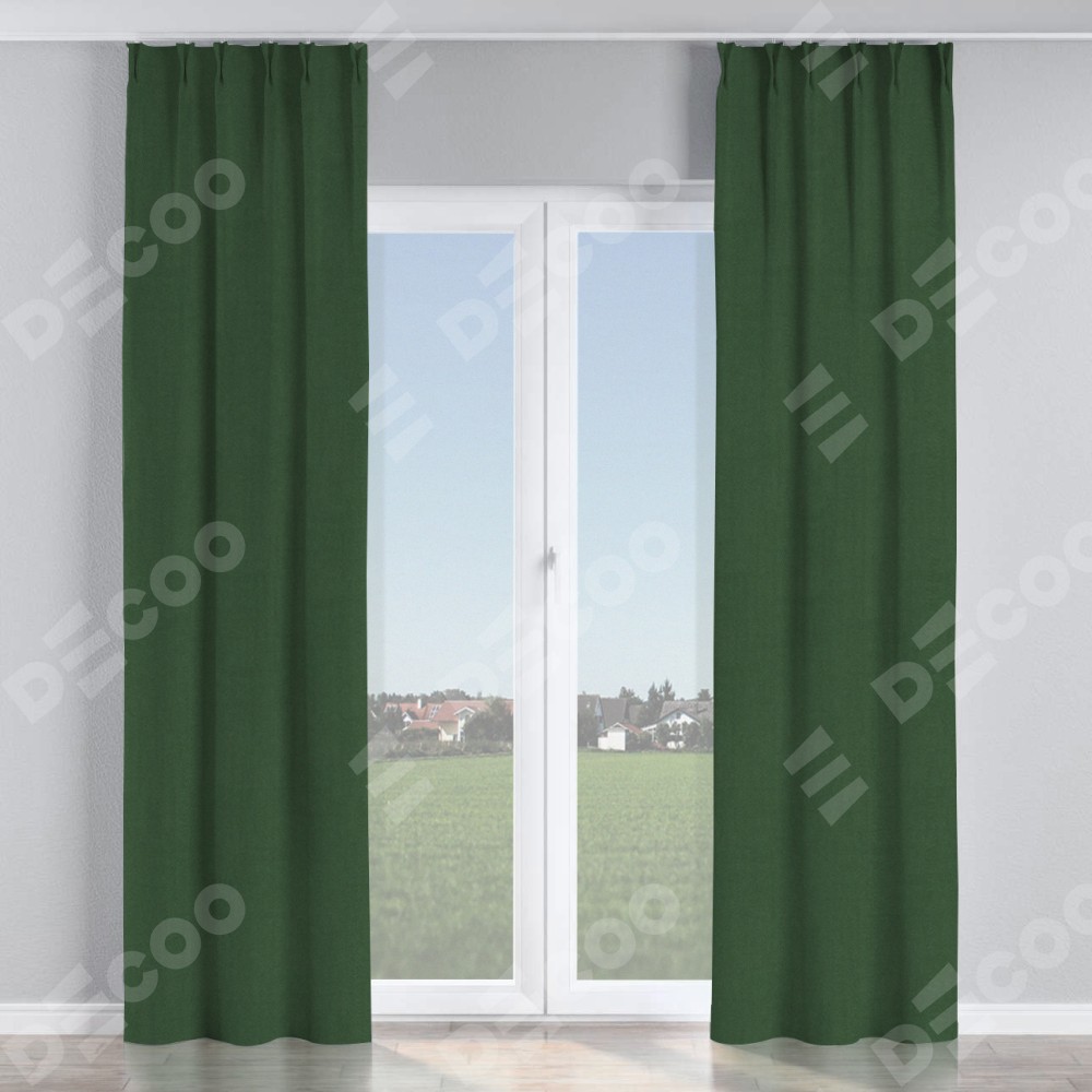 Комплект прямых штор, от производителя «Cortin», пошиты из ткани лён блэкаут зелёный, артикул ткани 69497. С изнаночной стороны в верхней части штор пристрачивается шторная лента с декоративными складками «Кустик». Для создания элегантных складок прямые шторы шьются по стандарту с коэффициентом 1:2 (на 100 см. ширины проёма 200 см. ширины ткани).