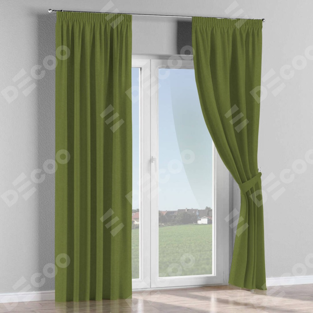 Комплект прямых штор, от производителя «Cortin», пошиты из ткани лён блэкаут оливковый, артикул ткани 69516. С изнаночной стороны в верхней части штор пристрачивается шторная лента с декоративными складками «Карандаш». Для создания элегантных складок прямые шторы шьются по стандарту с коэффициентом 1:2 (на 100 см. ширины проёма 200 см. ширины ткани).
