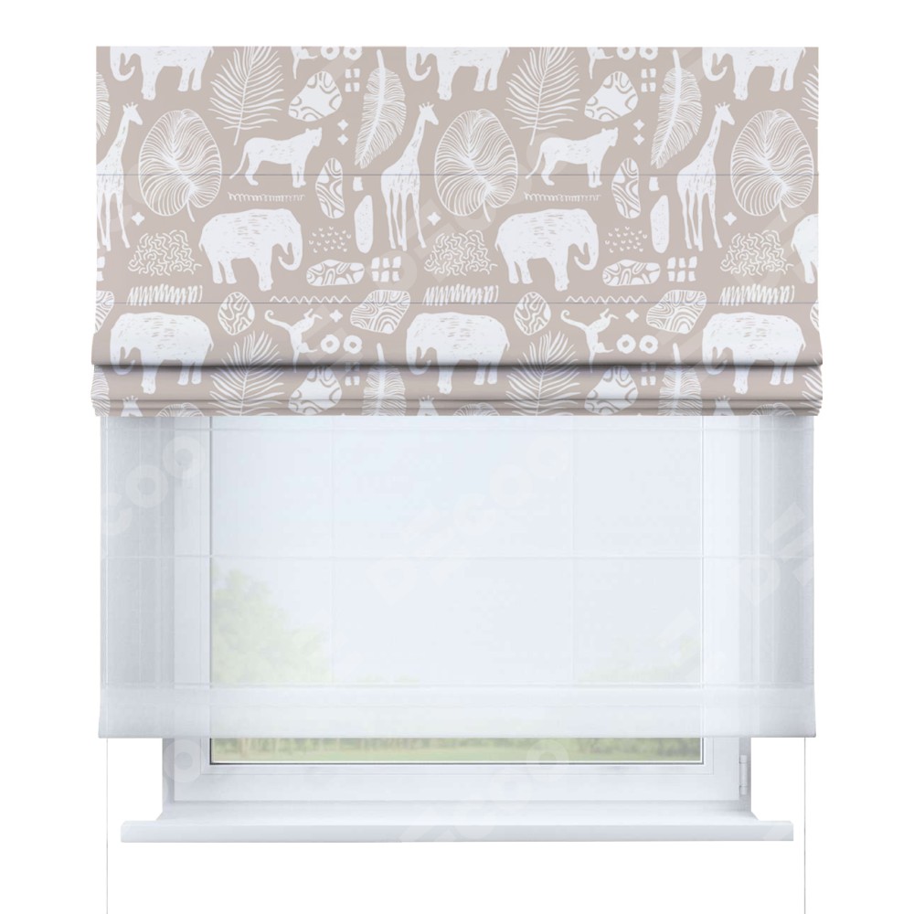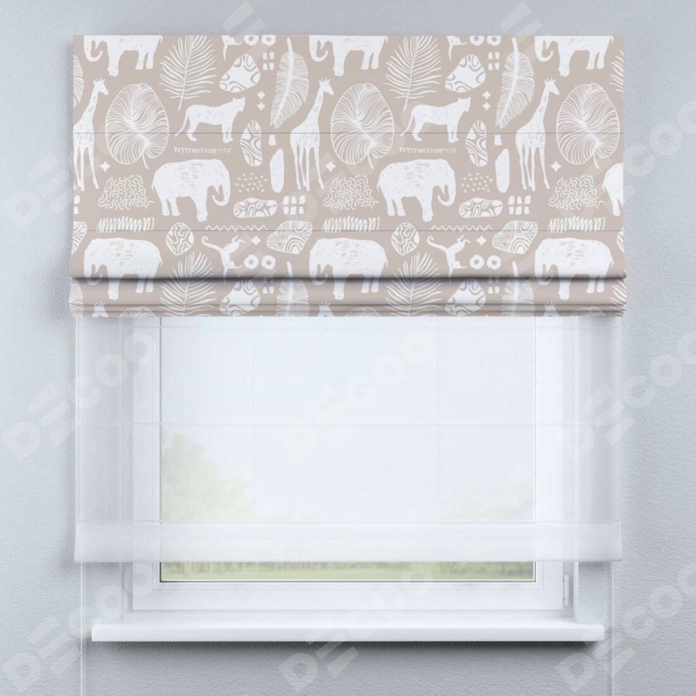 Римская штора день-ночь производителя «Cortin», используется для проёма, пошита из двух полотен, с лицевой блэкаут с нанесением сублимационной печати «Африканские животные», вторая ткань тюль (по стандарту комплектуется тюль белого цвета артикул V-01). Имеет универсальный механизм и подходит для монтажа: на потолок, на стену и в нишу.