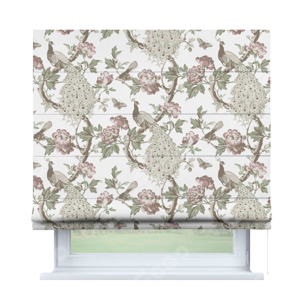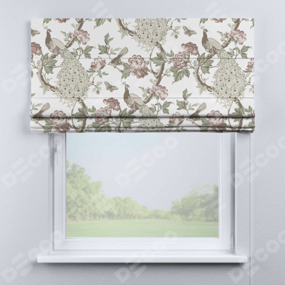 Римская штора производителя «Cortin», используется для проёма, пошита из ткани блэкаут с нанесением сублимационной печати «Гордые павлины». Имеет универсальный механизм и подходит для монтажа: на потолок, на стену и в нишу.
