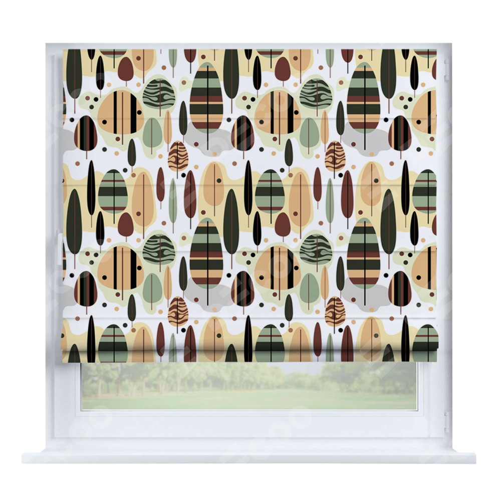 Римская штора производителя «Cortin», устанавливается на створку окна, пошита из ткани блэкаут с нанесением сублимационной печати «Деревья в полоску». Штора шьётся по индивидуальным размерам, для данного типа римской шторы возможная ширина от 35 до 150 см., высота до 250 см.
