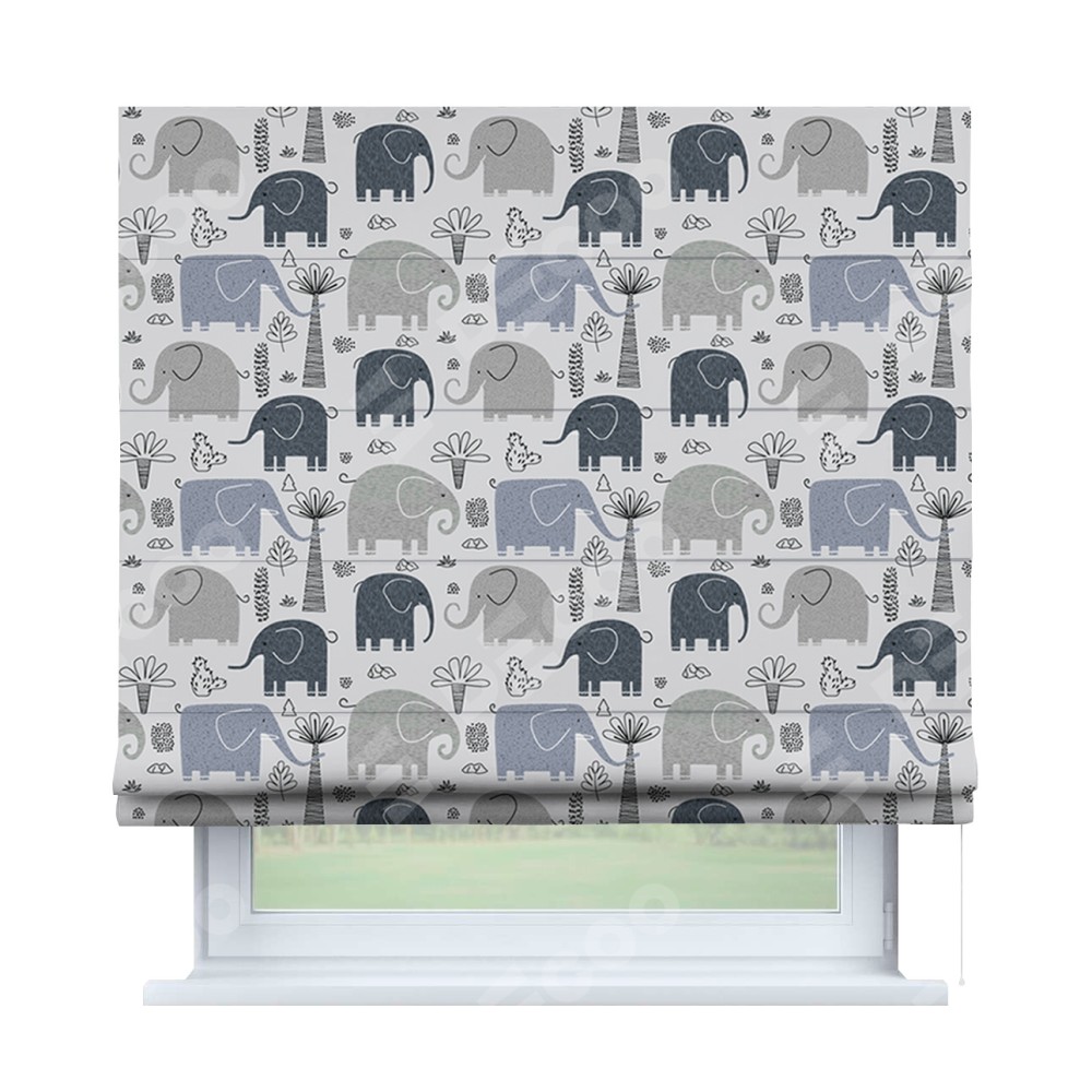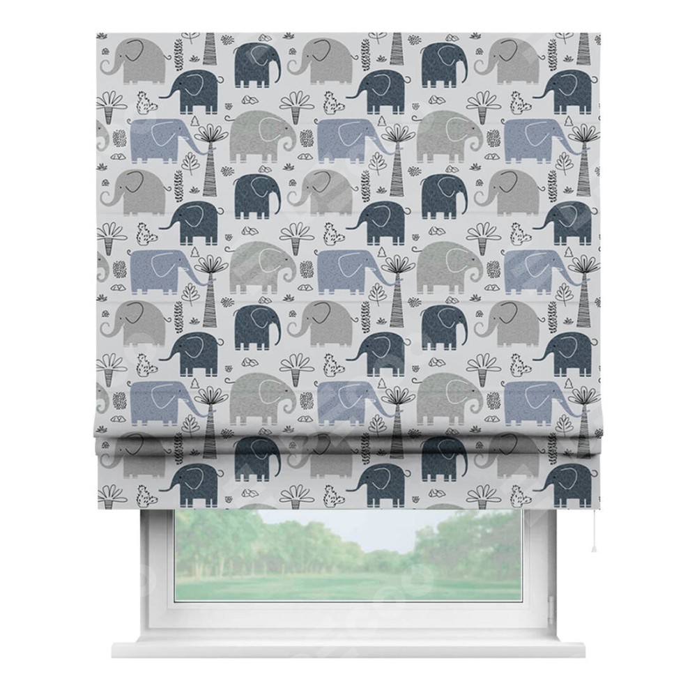 Римская штора производителя «Cortin», используется для проёма, пошита из ткани блэкаут с нанесением сублимационной печати «Серые слоники». Имеет универсальный механизм и подходит для монтажа: на потолок, на стену и в нишу.