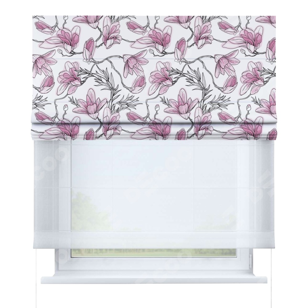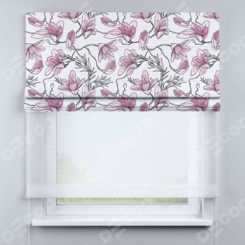 Римская штора день-ночь производителя «Cortin», используется для проёма, пошита из двух полотен, с лицевой блэкаут с нанесением сублимационной печати «Цветки магнолии», вторая ткань тюль (по стандарту комплектуется тюль белого цвета артикул V-01). Имеет универсальный механизм и подходит для монтажа: на потолок, на стену и в нишу.