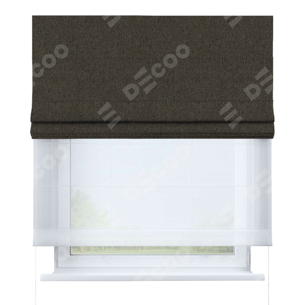 Римская штора день-ночь производителя «Cortin», используется для проёма, пошита из двух полотен, с лицевой стороны твид блэкаут тёмно-коричневый артикул 21584, вторая ткань тюль (по стандарту комплектуется тюль белого цвета артикул V-01). Имеет универсальный механизм и подходит для монтажа: на потолок, на стену и в нишу.