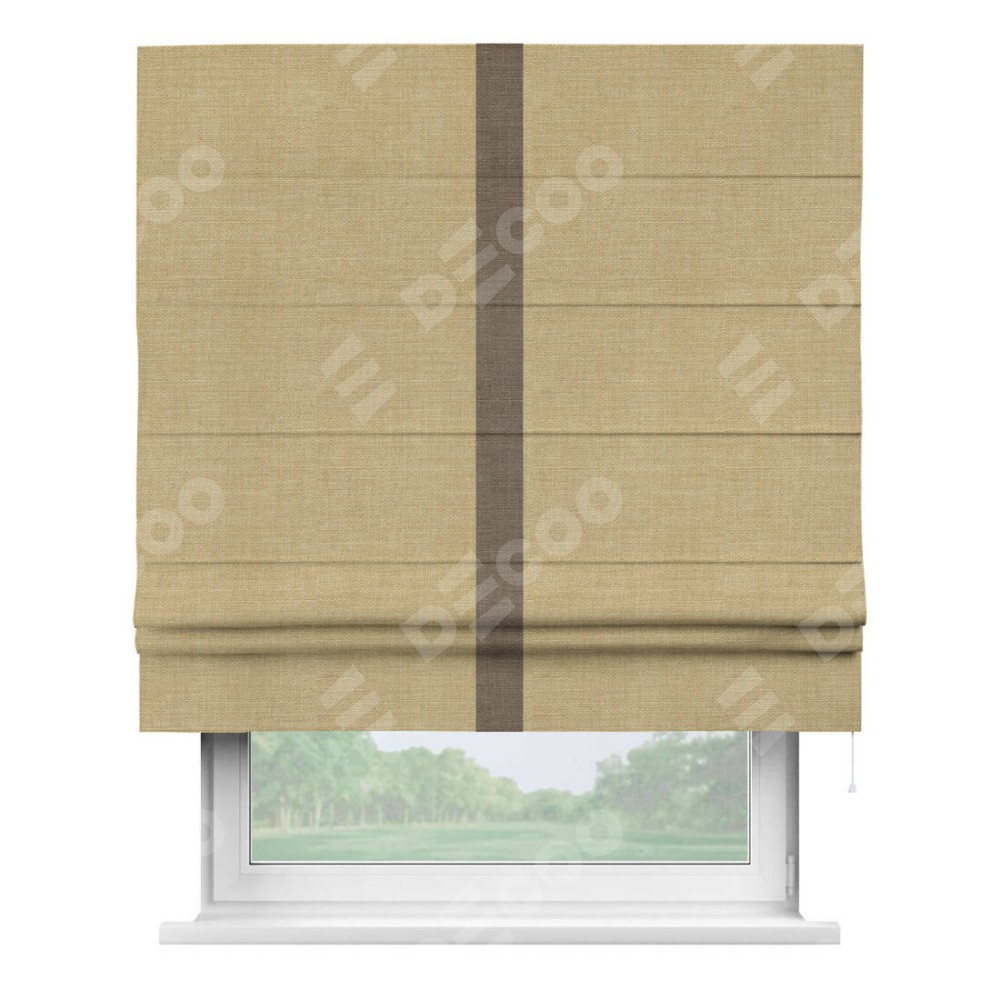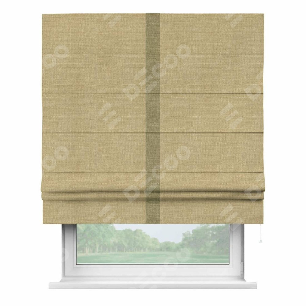 Римская штора производителя «Cortin», используется для проёма, пошита из ткани лён бежевый, артикул 7442. Отделка шторы кантом «Хайвэй», ткань для канта используется из льна разной расцветки на выбор. Имеет универсальный механизм и подходит для монтажа: на потолок, на стену и в нишу.