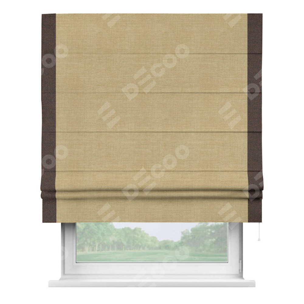 Римская штора производителя «Cortin», используется для проёма, пошита из ткани лён бежевый, артикул 7442. Отделка шторы кантом «Стрим Дуо», ткань для канта используется из льна разной расцветки на выбор. Имеет универсальный механизм и подходит для монтажа: на потолок, на стену и в нишу.