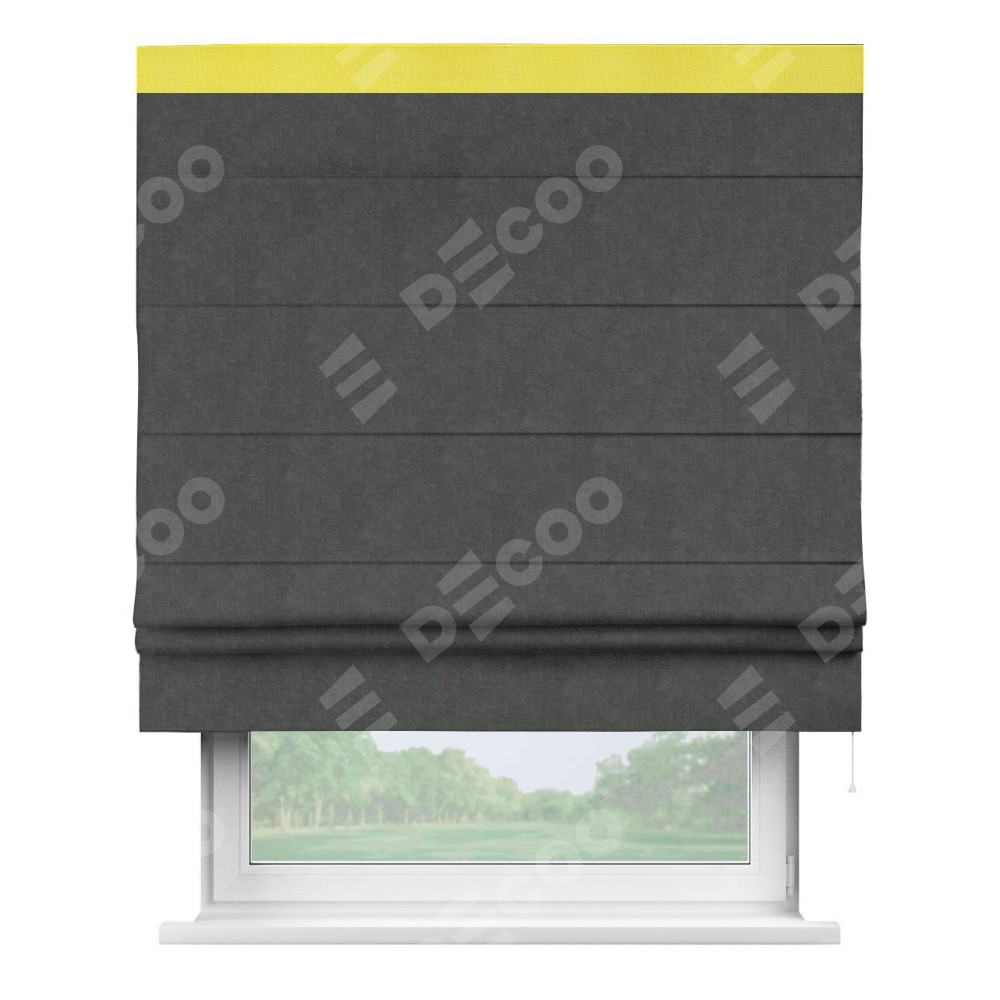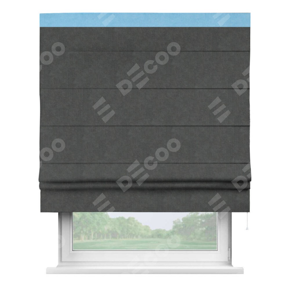 Римская штора производителя «Cortin», используется для проёма, пошита из ткани вельвет тёмно-серый, артикул ткани 33811. Отделка шторы кантом «Кинг», ткань для канта используется из вельвета разной расцветки на выбор. Имеет универсальный механизм и подходит для монтажа: на потолок, на стену и в нишу.