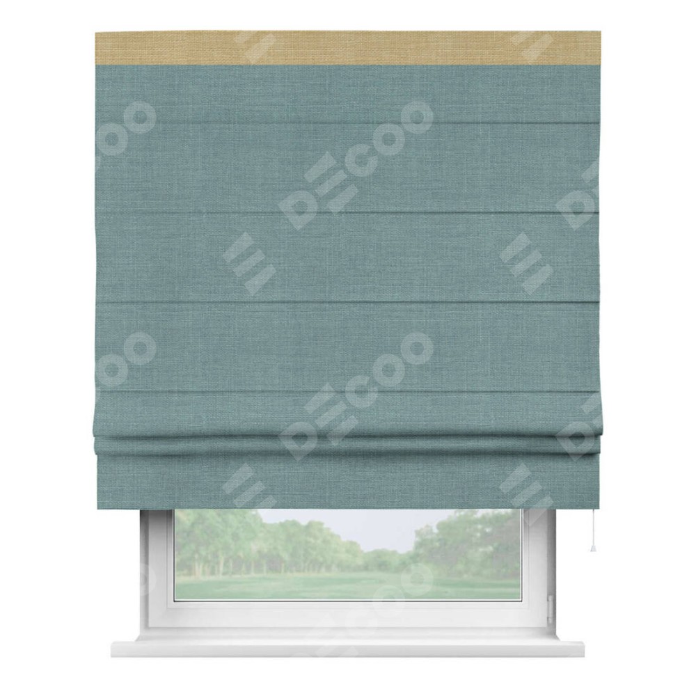 Римская штора производителя «Cortin», используется для проёма, пошита из ткани лён голубой, артикул 74 736. Отделка шторы кантом «Кинг», ткань для канта используется из льна разной расцветки на выбор. Имеет универсальный механизм и подходит для монтажа: на потолок, на стену и в нишу.