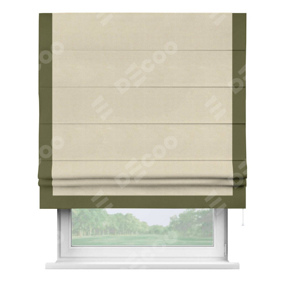 Римская штора производителя «Cortin», используется для проёма, пошита из ткани блэкаут однотонный бежевый, артикул ткани 13125. Отделка шторы кантом «Виктория», ткань для канта используется из блэкаута однотонного разной расцветки на выбор. Имеет универсальный механизм и подходит для монтажа: на потолок, на стену и в нишу.