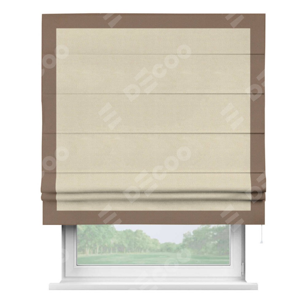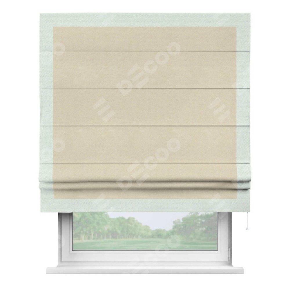 Римская штора производителя «Cortin», используется для проёма, пошита из ткани блэкаут однотонный бежевый, артикул ткани 13125. Отделка шторы кантом «Чесс», ткань для канта используется из блэкаута однотонного разной расцветки на выбор. Имеет универсальный механизм и подходит для монтажа: на потолок, на стену и в нишу.