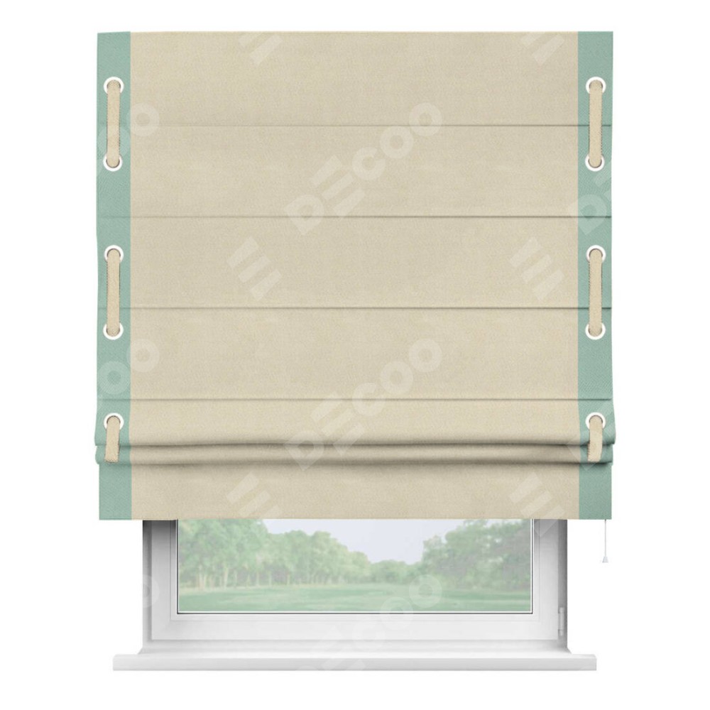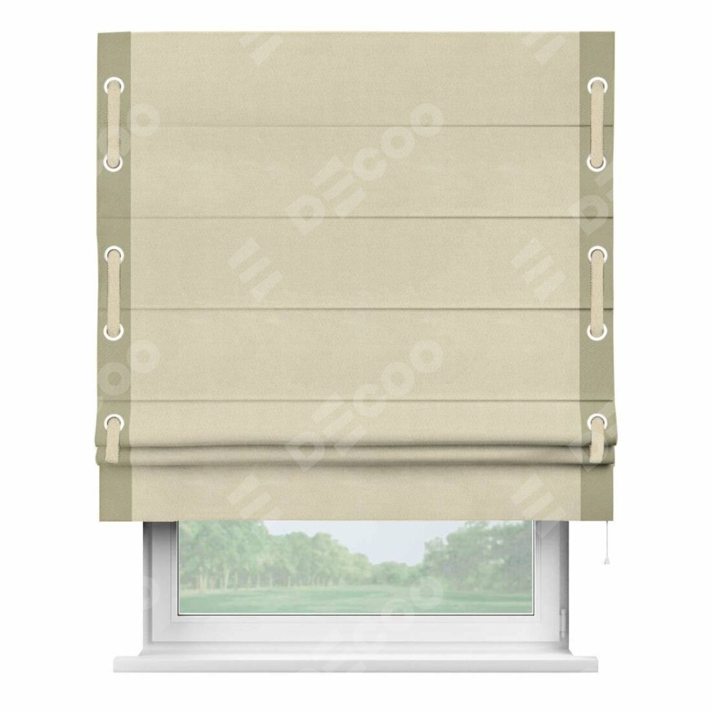Римская штора производителя «Cortin», используется для проёма, пошита из ткани блэкаут однотонный бежевый, артикул ткани 13125. Отделка шторы кантом «Стрим Дуо» на кантах расположены люверсы с пояском, ткань для канта используется из блэкаута однотонного разной расцветки на выбор. Ткань для пояска обычно используется из основной ткани шторы, а так же можно сделать из любой расцветки по желанию. Имеет универсальный механизм и подходит для монтажа: на потолок, на стену и в нишу.