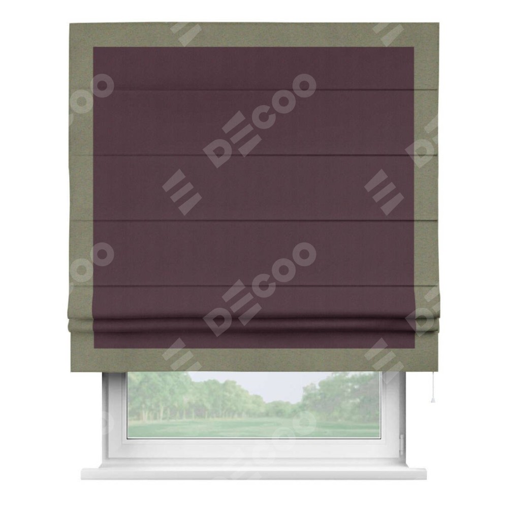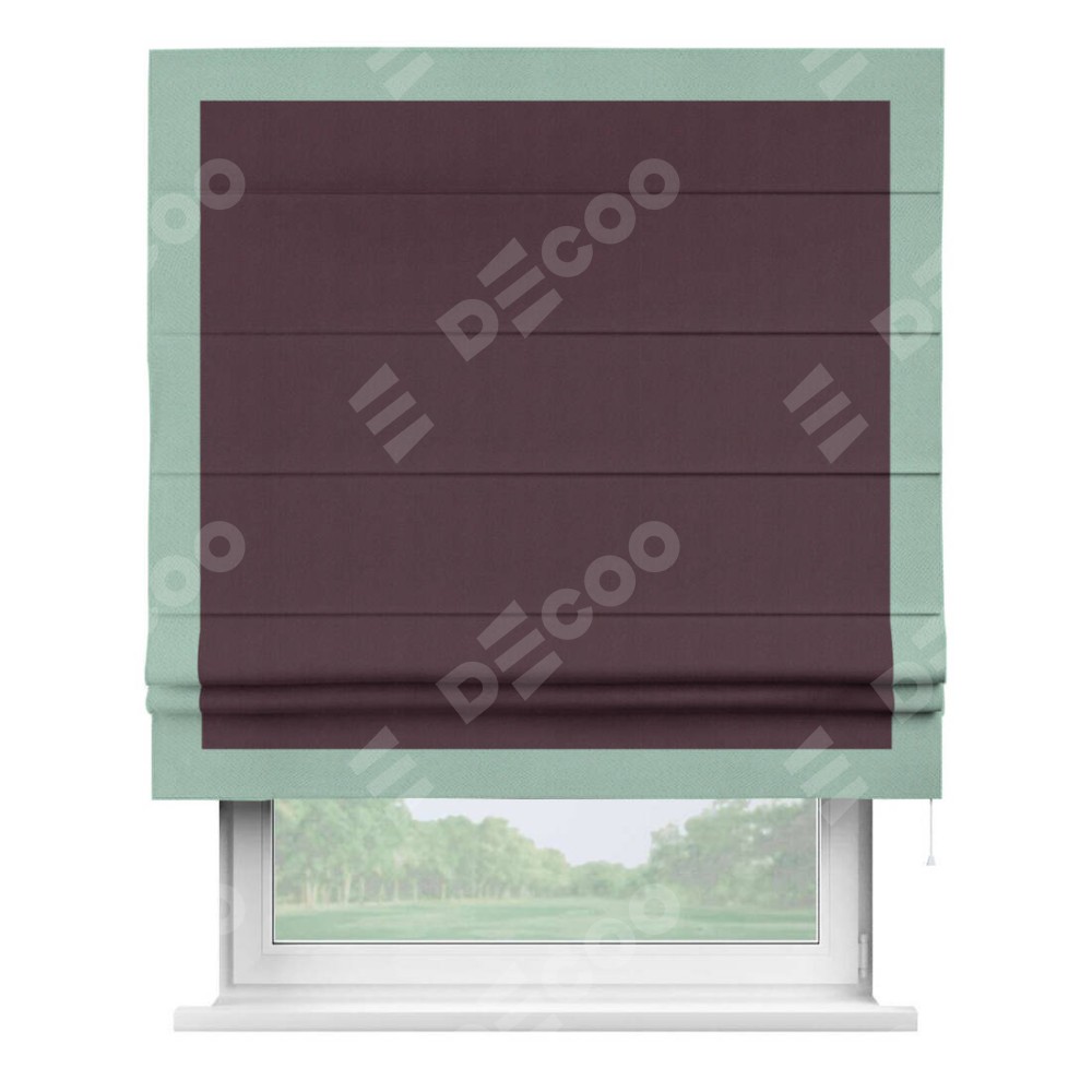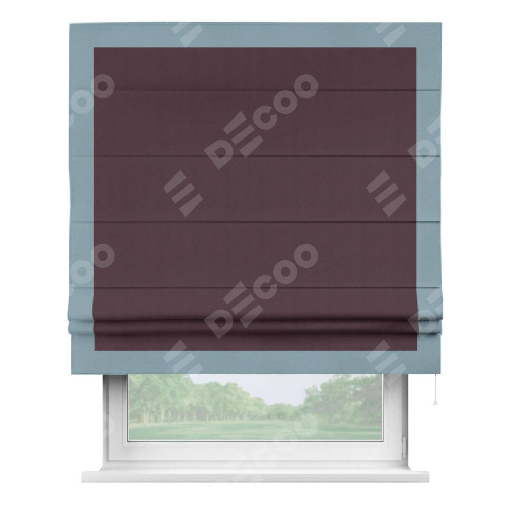 Римская штора производителя «Cortin», используется для проёма, пошита из ткани блэкаут однотонный сиреневый, артикул ткани 29333−2. Отделка шторы кантом «Чесс», ткань для канта используется из блэкаута однотонного разной расцветки на выбор. Имеет универсальный механизм и подходит для монтажа: на потолок, на стену и в нишу.
