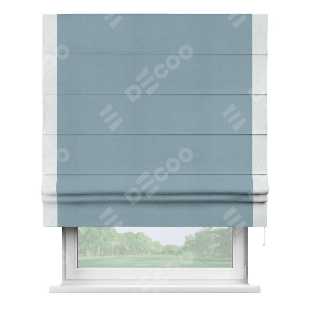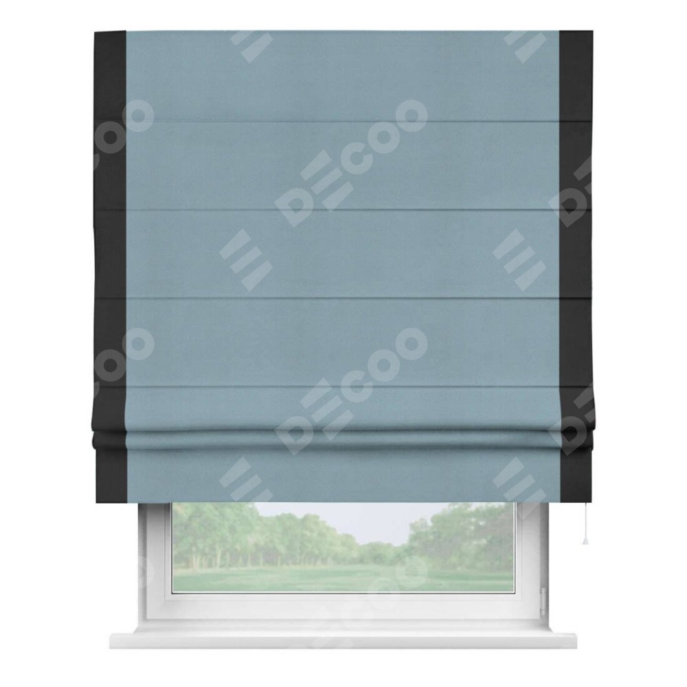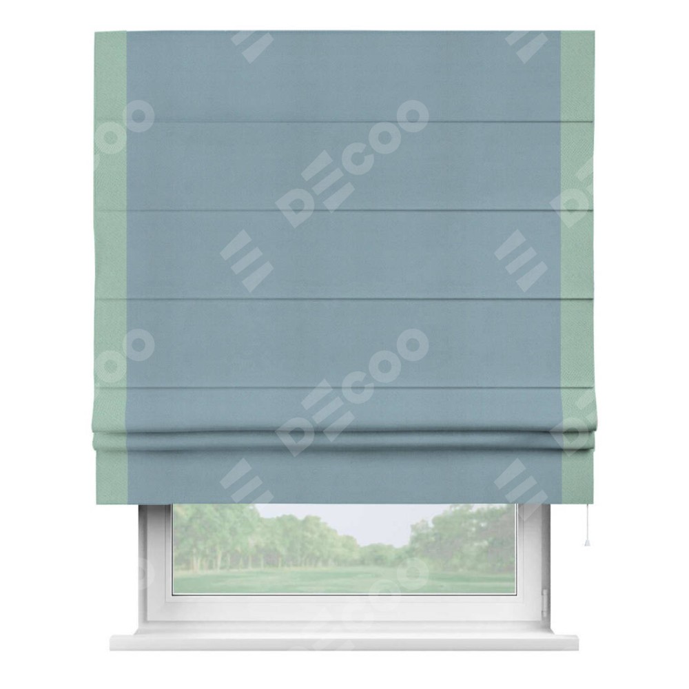 Римская штора производителя «Cortin», используется для проёма, пошита из ткани блэкаут однотонный серо-голубой, артикул ткани 29327−2. Отделка шторы кантом «Стрим Дуо», ткань для канта используется из блэкаута однотонного разной расцветки на выбор. Имеет универсальный механизм и подходит для монтажа: на потолок, на стену и в нишу.