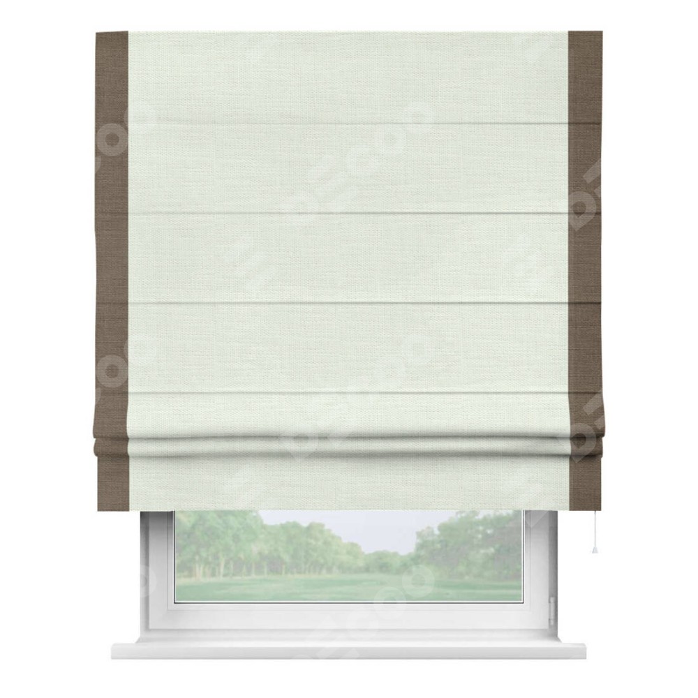 Римская штора производителя «Cortin», используется для проёма, пошита из ткани лён молочный, артикул 23568. Отделка шторы кантом «Стрим Дуо», ткань для канта используется из льна разной расцветки на выбор. Имеет универсальный механизм и подходит для монтажа: на потолок, на стену и в нишу.