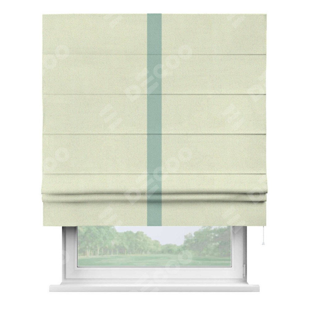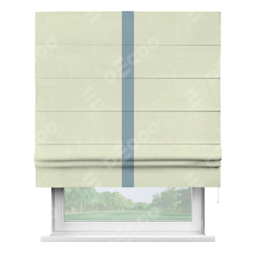 Римская штора производителя «Cortin», используется для проёма, пошита из ткани блэкаут однотонный сливочный, артикул ткани 6668−02. Отделка шторы кантом «Хайвей», ткань для канта используется из блэкаута однотонного разной расцветки на выбор. Имеет универсальный механизм и подходит для монтажа: на потолок, на стену и в нишу.
