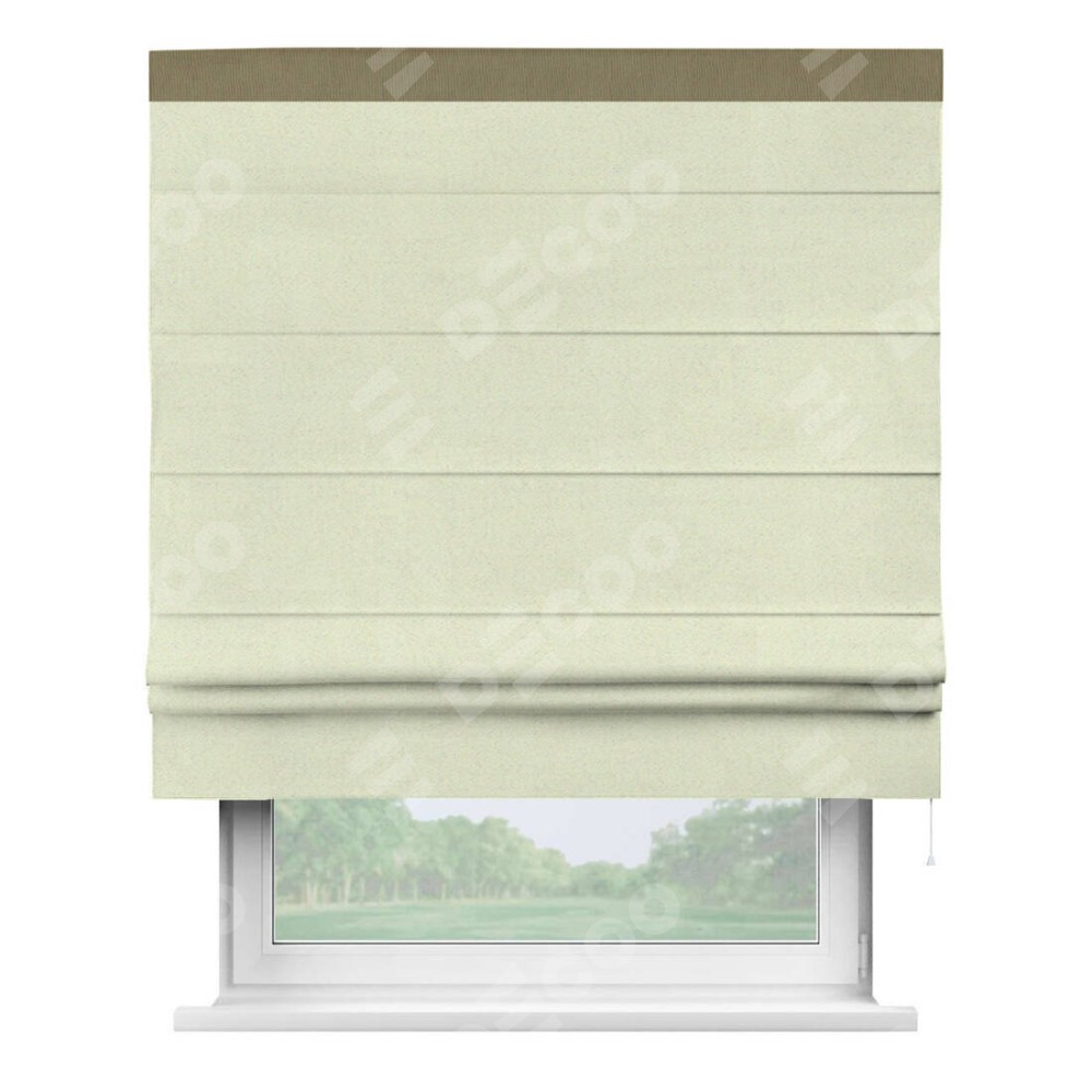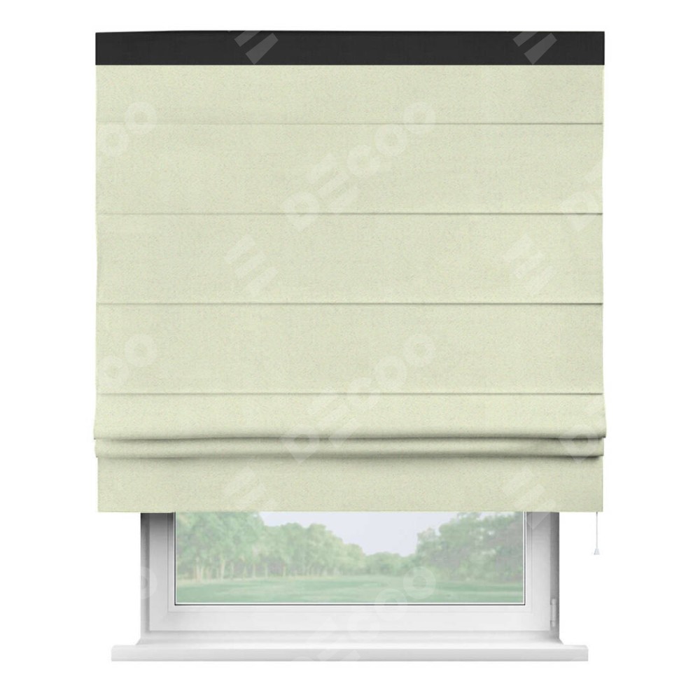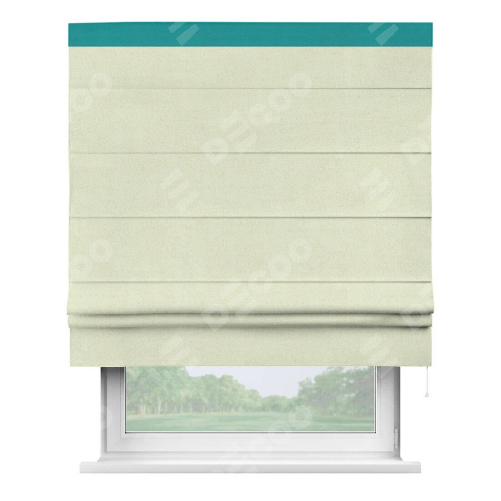Римская штора производителя «Cortin», используется для проёма, пошита из ткани блэкаут однотонный сливочный, артикул ткани 6668−02. Отделка шторы кантом «Кинг», ткань для канта используется из блэкаута однотонного разной расцветки на выбор. Имеет универсальный механизм и подходит для монтажа: на потолок, на стену и в нишу.
