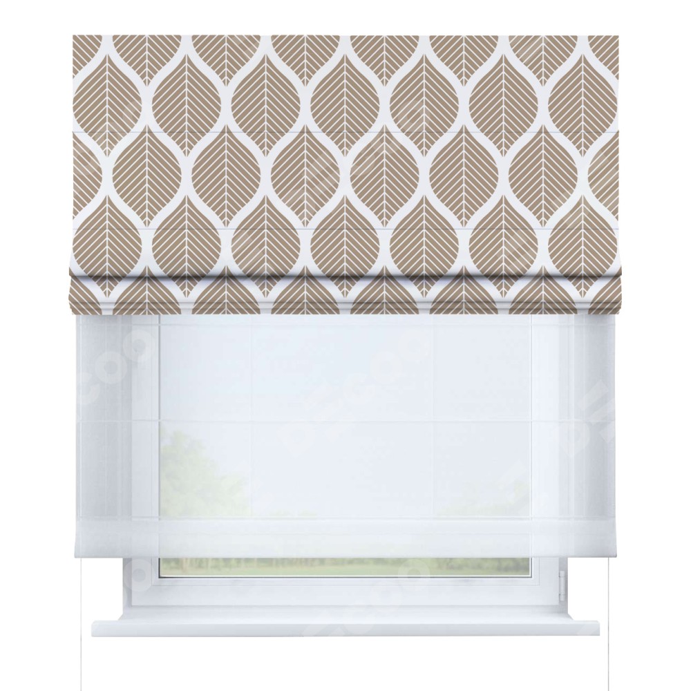 Римская штора день-ночь производителя «Cortin», используется для проёма, пошита из двух полотен, с лицевой блэкаут с нанесением сублимационной печати «Листья геометрия», вторая ткань тюль (по стандарту комплектуется тюль белого цвета артикул V-01). Имеет универсальный механизм и подходит для монтажа: на потолок, на стену и в нишу.