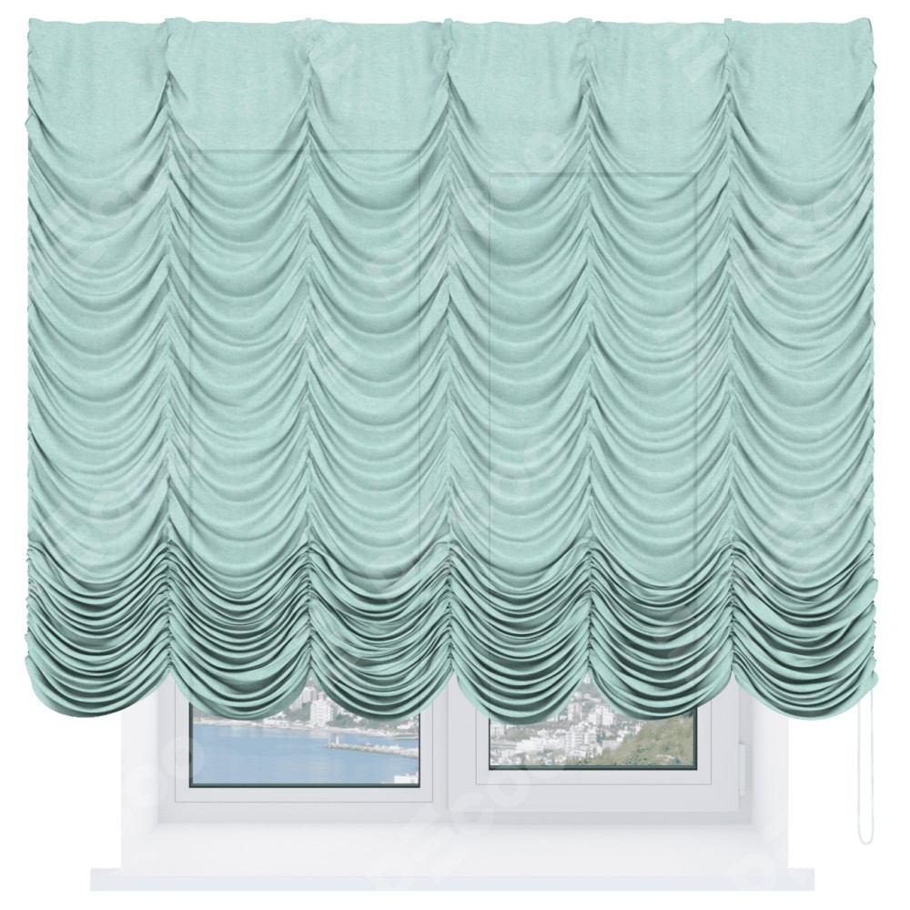 Французская штора производителя «Cortin», используется для проёма, пошита из ткани лён кашемир мятный, артикул ткани 21617. Имеет универсальный механизм и подходит для монтажа: на потолок и на стену.