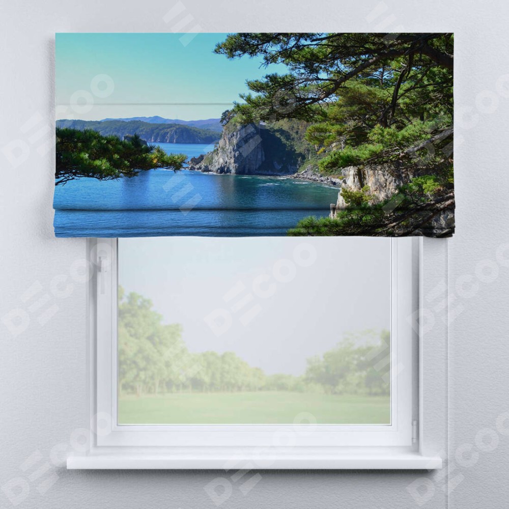 Римская штора «Кортин» для проема «Море и сосны» отлично подойдёт для интерьера: в кухню, в гостиную и в спальню.