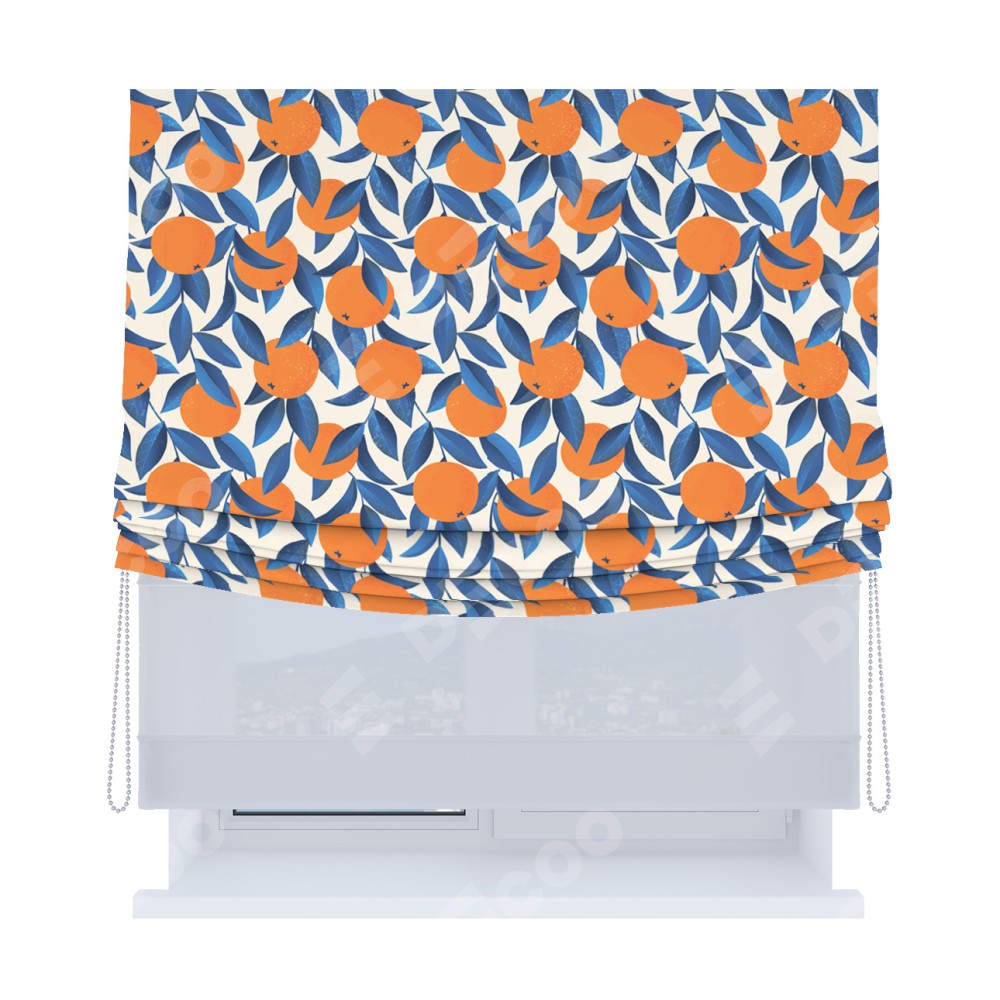 Римская штора день-ночь производителя «Cortin», используется для проёма, пошита из двух полотен, с лицевой блэкаут с нанесением сублимационной печати «Апельсиновое настроение», вторая ткань тюль (по стандарту комплектуется тюль белого цвета артикул V-01). Имеет универсальный механизм и подходит для монтажа: на потолок, на стену и в нишу. Удобное управление каждой шторой отдельно.