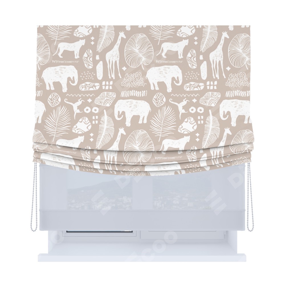 Римская штора день-ночь производителя «Cortin», используется для проёма, пошита из двух полотен, с лицевой блэкаут с нанесением сублимационной печати «Африканские животные», вторая ткань тюль (по стандарту комплектуется тюль белого цвета артикул V-01). Имеет универсальный механизм и подходит для монтажа: на потолок, на стену и в нишу. Удобное управление каждой шторой отдельно.