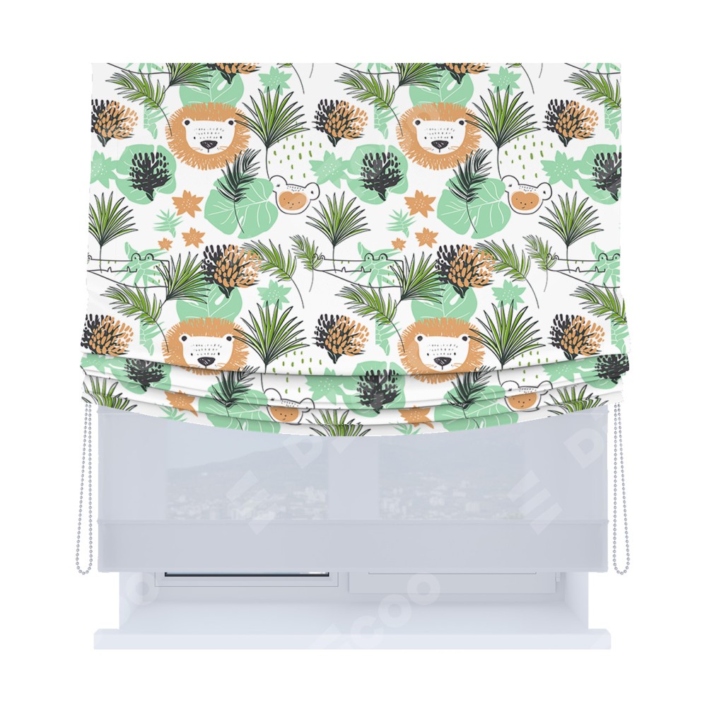 Римская штора день-ночь производителя «Cortin», используется для проёма, пошита из двух полотен, с лицевой блэкаут с нанесением сублимационной печати «Животные из джунглей», вторая ткань тюль (по стандарту комплектуется тюль белого цвета артикул V-01). Имеет универсальный механизм и подходит для монтажа: на потолок, на стену и в нишу. Удобное управление каждой шторой отдельно.