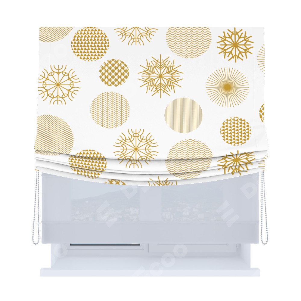 Римская штора день-ночь производителя «Cortin», используется для проёма, пошита из двух полотен, с лицевой блэкаут с нанесением сублимационной печати «Золотые шары», вторая ткань тюль (по стандарту комплектуется тюль белого цвета артикул V-01). Имеет универсальный механизм и подходит для монтажа: на потолок, на стену и в нишу. Удобное управление каждой шторой отдельно.