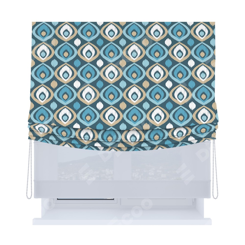 Римская штора день-ночь производителя «Cortin», используется для проёма, пошита из двух полотен, с лицевой блэкаут с нанесением сублимационной печати «Икат орнамент», вторая ткань тюль (по стандарту комплектуется тюль белого цвета артикул V-01). Имеет универсальный механизм и подходит для монтажа: на потолок, на стену и в нишу. Удобное управление каждой шторой отдельно.