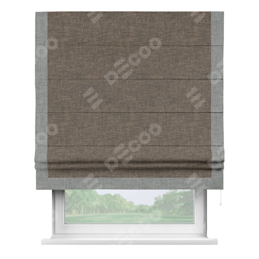 Римская штора производителя «Cortin», используется для проёма, пошита из ткани рогожка димаут коричневый, артикул 80420. Отделка шторы кантом «Виктория», ткань для канта используется из рогожки димаут разной расцветки на выбор. Имеет универсальный механизм и подходит для монтажа: на потолок, на стену и в нишу.