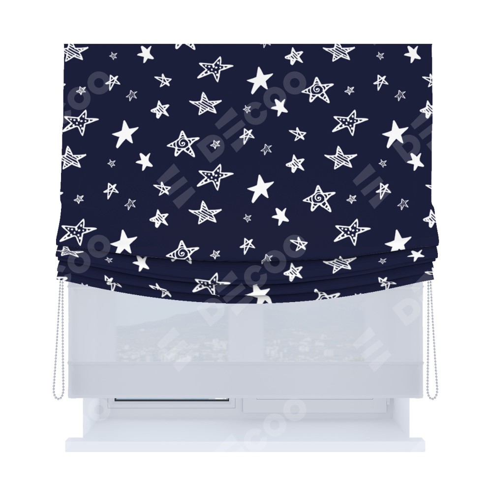 Римская штора день-ночь производителя «Cortin», используется для проёма, пошита из двух полотен, с лицевой блэкаут с нанесением сублимационной печати «Ночные звёзды», вторая ткань тюль (по стандарту комплектуется тюль белого цвета артикул V-01). Имеет универсальный механизм и подходит для монтажа: на потолок, на стену и в нишу. Удобное управление каждой шторой отдельно.