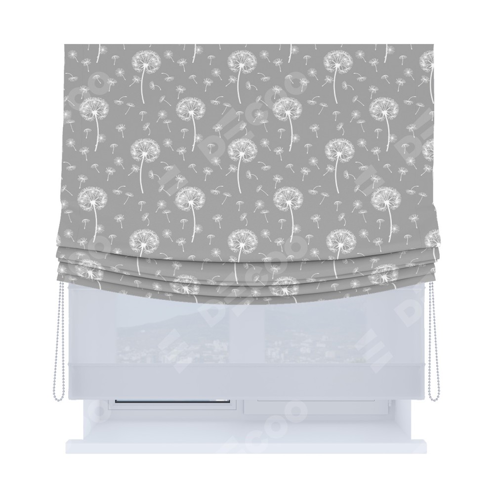 Римская штора день-ночь производителя «Cortin», используется для проёма, пошита из двух полотен, с лицевой блэкаут с нанесением сублимационной печати «Одуванчики», вторая ткань тюль (по стандарту комплектуется тюль белого цвета артикул V-01). Имеет универсальный механизм и подходит для монтажа: на потолок, на стену и в нишу. Удобное управление каждой шторой отдельно.