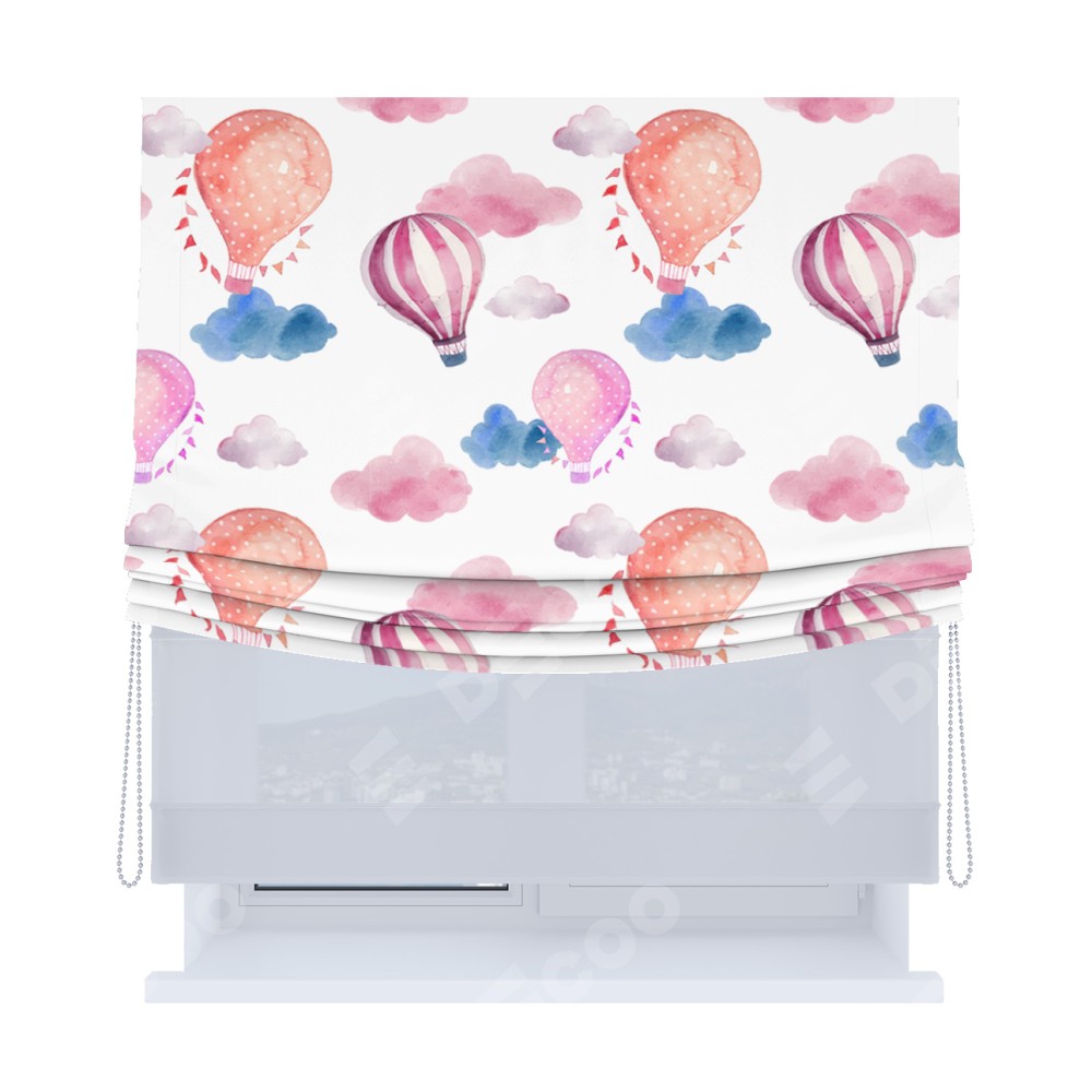 Римская штора день-ночь производителя «Cortin», используется для проёма, пошита из двух полотен, с лицевой блэкаут с нанесением сублимационной печати «Полёт в облаках», вторая ткань тюль (по стандарту комплектуется тюль белого цвета артикул V-01). Имеет универсальный механизм и подходит для монтажа: на потолок, на стену и в нишу. Удобное управление каждой шторой отдельно.