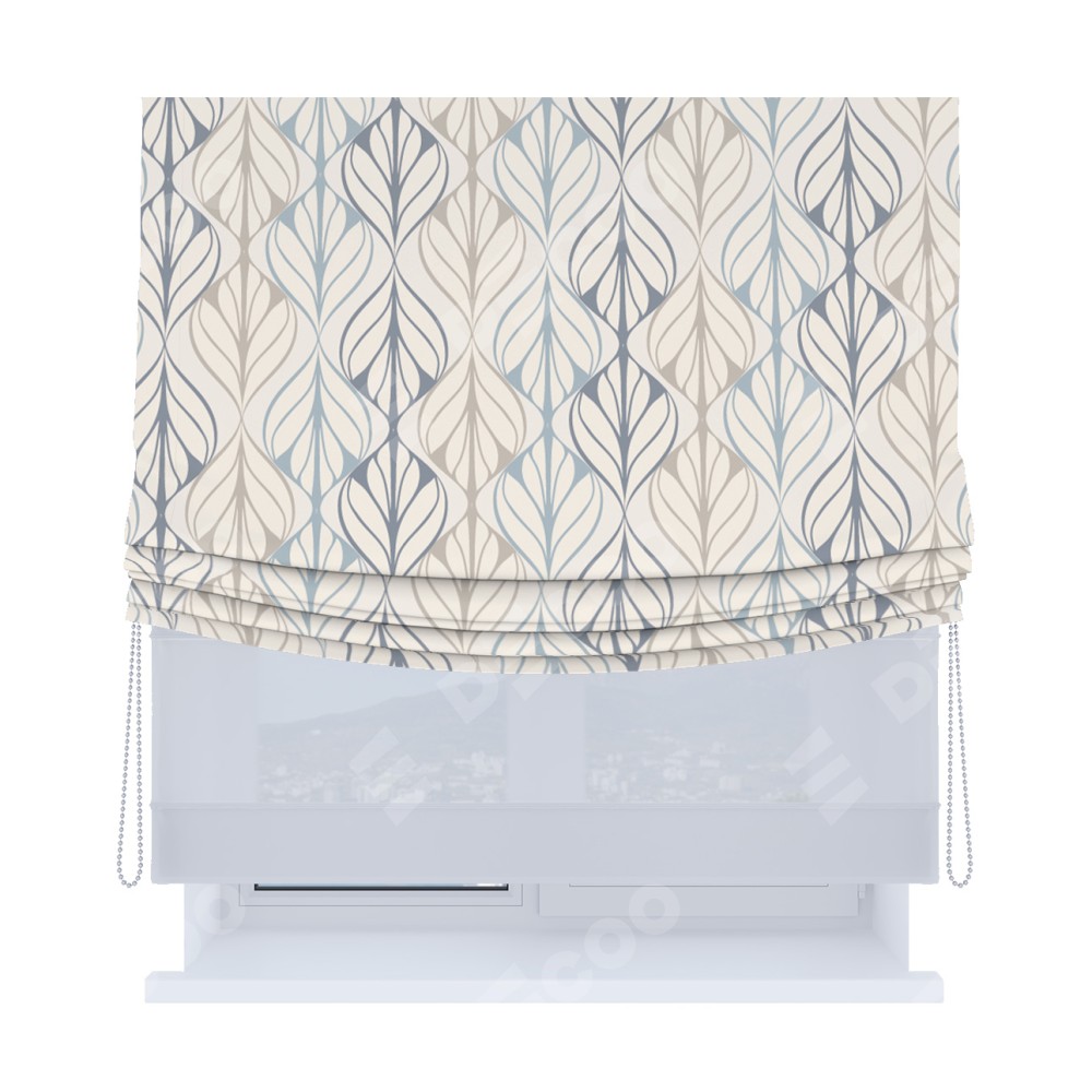 Римская штора день-ночь производителя «Cortin», используется для проёма, пошита из двух полотен, с лицевой блэкаут с нанесением сублимационной печати «Растительный орнамент», вторая ткань тюль (по стандарту комплектуется тюль белого цвета артикул V-01). Имеет универсальный механизм и подходит для монтажа: на потолок, на стену и в нишу. Удобное управление каждой шторой отдельно.