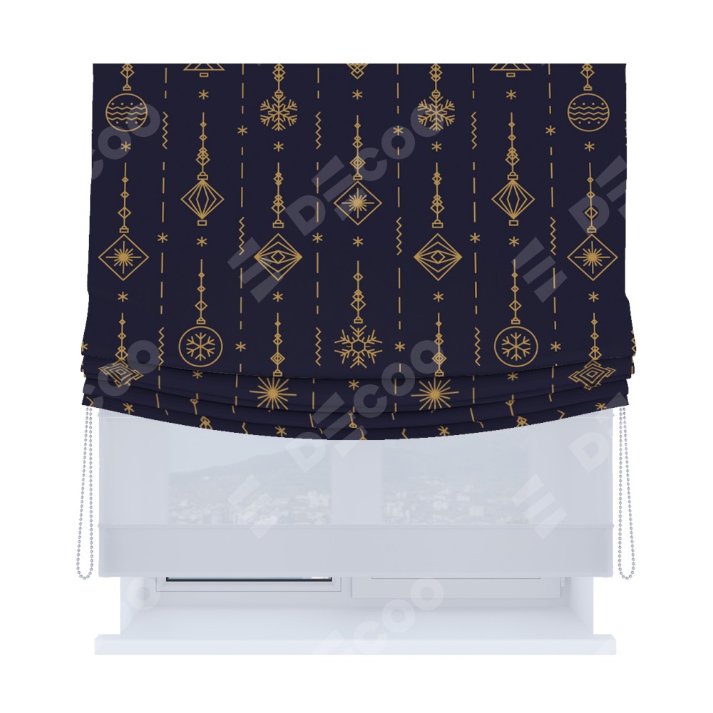 Римская штора день-ночь производителя «Cortin», используется для проёма, пошита из двух полотен, с лицевой блэкаут с нанесением сублимационной печати «Сияние гирлянд», вторая ткань тюль (по стандарту комплектуется тюль белого цвета артикул V-01). Имеет универсальный механизм и подходит для монтажа: на потолок, на стену и в нишу. Удобное управление каждой шторой отдельно.