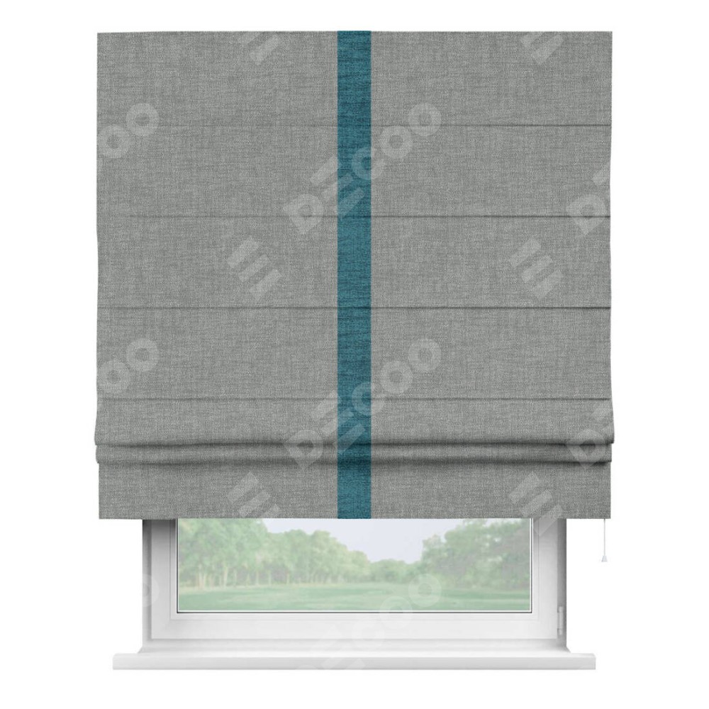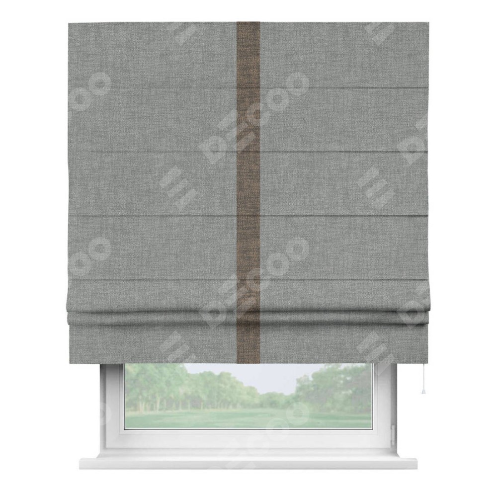 Римская штора производителя «Cortin», используется для проёма, пошита из ткани рогожка димаут тёмно-серый, артикул 80418. Отделка шторы кантом «Хайвэй», ткань для канта используется из рогожки димаут разной расцветки на выбор. Имеет универсальный механизм и подходит для монтажа: на потолок, на стену и в нишу.