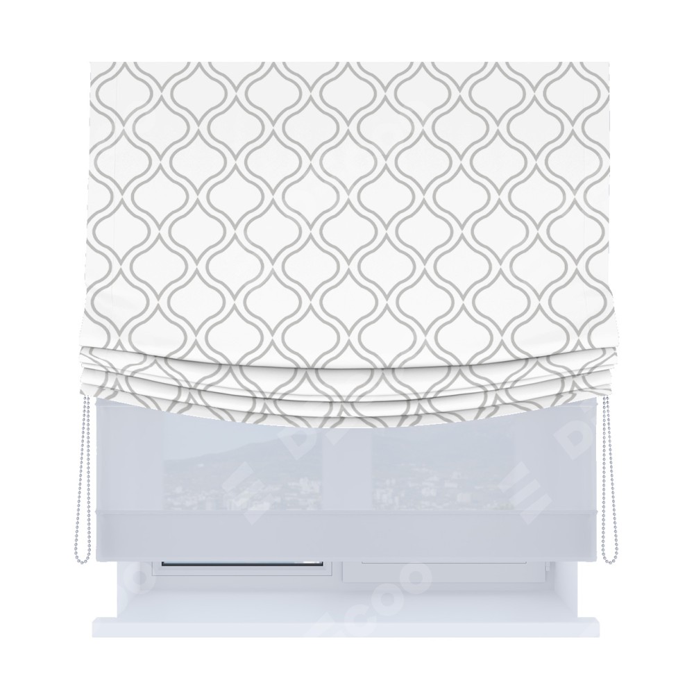 Римская штора день-ночь производителя «Cortin», используется для проёма, пошита из двух полотен, с лицевой блэкаут с нанесением сублимационной печати «Тайны востока белый», вторая ткань тюль (по стандарту комплектуется тюль белого цвета артикул V-01). Имеет универсальный механизм и подходит для монтажа: на потолок, на стену и в нишу. Удобное управление каждой шторой отдельно.