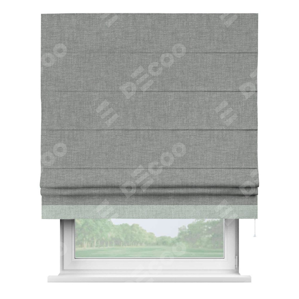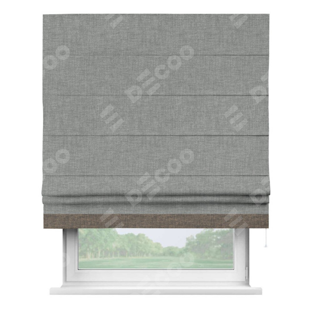 Римская штора производителя «Cortin», используется для проёма, пошита из ткани рогожка димаут тёмно-серый, артикул 80418. Отделка шторы кантом «Джестер», ткань для канта используется из рогожки димаут разной расцветки на выбор. Имеет универсальный механизм и подходит для монтажа: на потолок, на стену и в нишу.