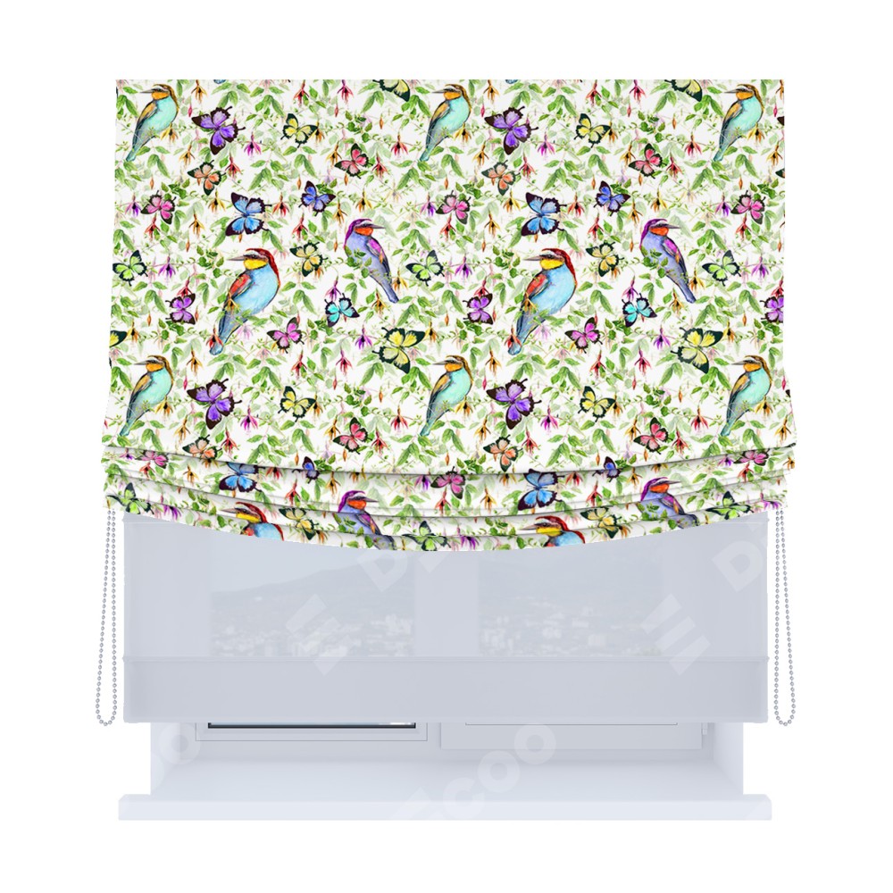 Римская штора день-ночь производителя «Cortin», используется для проёма, пошита из двух полотен, с лицевой блэкаут с нанесением сублимационной печати «Тропические птицы», вторая ткань тюль (по стандарту комплектуется тюль белого цвета артикул V-01). Имеет универсальный механизм и подходит для монтажа: на потолок, на стену и в нишу. Удобное управление каждой шторой отдельно.