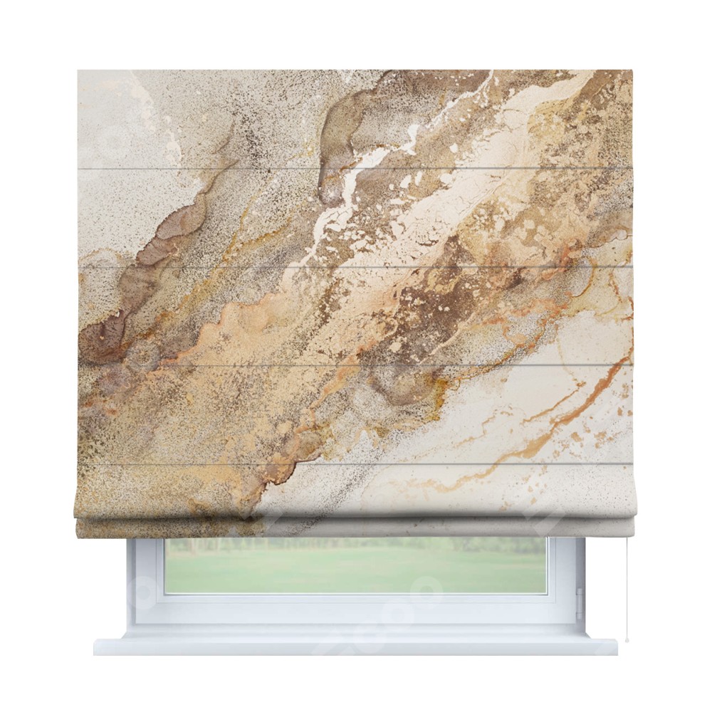 Римская штора производителя «Cortin», используется для проёма, пошита из ткани блэкаут с нанесением сублимационной печати «Бежево-золотой мрамор». Имеет универсальный механизм и подходит для монтажа: на потолок, на стену и в нишу.